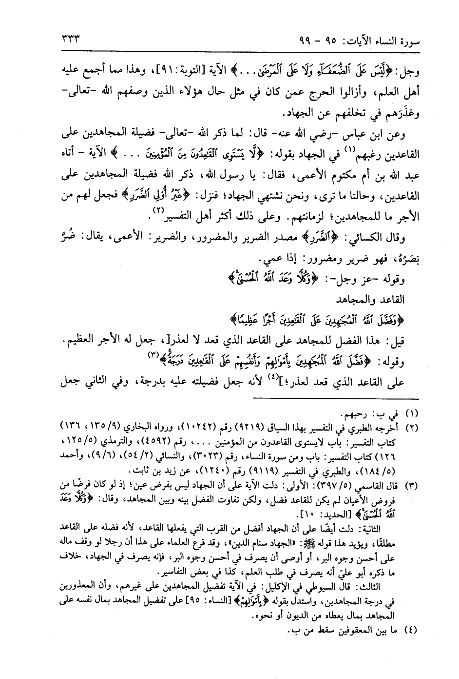 وقوله: (فَضَّلَ اللَّهُ الْمُجَاهِدِينَ بِأَمْوَالِهِمْ وَأَنْفُسِهِمْ عَلَى الْقَاعِدِينَ دَرَجَةً)