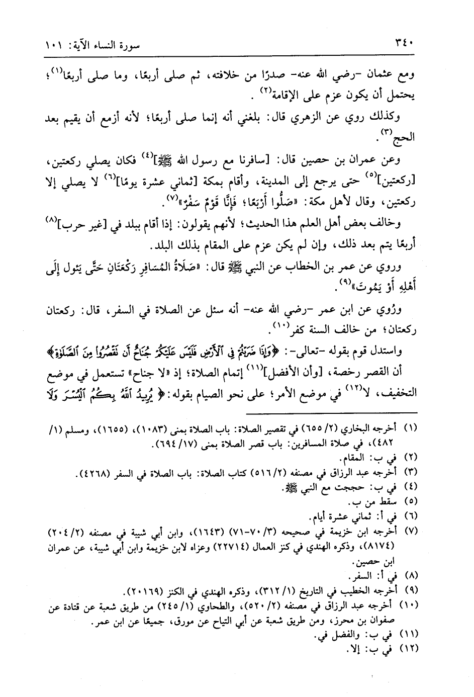 وعن عمران بن حصين قال: " سافرنا مع رسول اللَّه - صَلَّى اللَّهُ عَلَيهِ وَسَلَّمَ -، فكان يصلي ركعتين، ركعتين حتى يرجع إلى المدينة، وأقام بمكة ثماني عشرة يومًا، لا يصلي إلا ركعتين، وقال لأهل مكة: " صَلُّوا أَرْبَعًا؛ فَإِنَّا قَومٌ سَفْرٌ ".