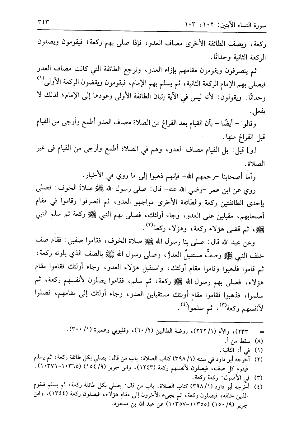 وعن عبد اللَّه قال: صلى بنا رسول اللَّه - صَلَّى اللَّهُ عَلَيهِ وَسَلَّمَ - صلاة الخوف، فقاموا صفين: فقام صف خلف النبي - صَلَّى اللَّهُ عَلَيهِ وَسَلَّمَ - وصفٌّ مستقبل العدو، وصلى رسول اللَّه - صَلَّى اللَّهُ عَلَيهِ وَسَلَّمَ - بالصف الذي يلونه ركعة، ثم قاموا فذهبوا وقاموا مقام أُولَئِكَ، واستقبل هَؤُلَاءِ العدو، وجاء أُولَئِكَ فقاموا مقام هَؤُلَاءِ، فصلى بهم رسول اللَّه - صَلَّى اللَّهُ عَلَيهِ وَسَلَّمَ - ركعة، ثم سلم، فقاموا يصلون لأنفسهم ركعة، ثم سلموا، فذهبوا فقاموا مقام أُولَئِكَ مستقبلين العدو، وجاء أُولَئِكَ إلى مقامهم، فصلوا لأنفسهم ركعة، ثم سلموا.