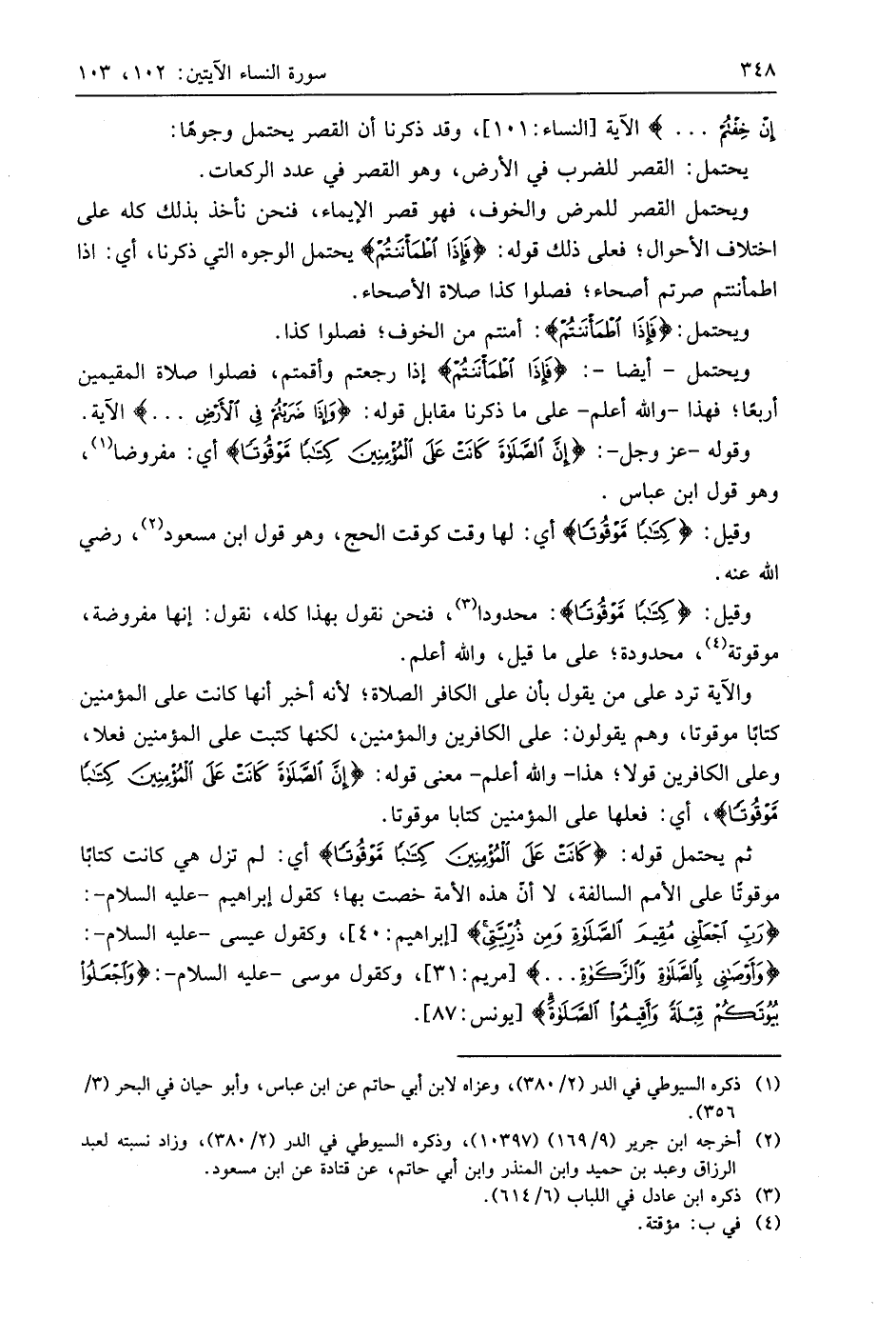 ثم يحتمل قوله: (كَانَتْ عَلَى الْمُؤْمِنِينَ كِتَابًا مَوْقُوتًا) أي: لم تزل هي كانت كتابًا موقوتًا على الأمم السالفة، لا أن هذه الأمة خصت بها؛ كقول إبراهيم - عليه السلام -: (رَبِّ اجْعَلْنِي مُقِيمَ الصَّلَاةِ وَمِنْ ذُرِّيَّتِي)، وكقول عيسى - عليه السلام -: (وَأَوْصَانِي بِالصَّلَاةِ وَالزَّكَاةِ. . .)، وكقول موسى - عليه السلام -: (وَاجْعَلُوا بُيُوتَكُمْ قِبْلَةً وَأَقِيمُوا الصَّلَاةَ).