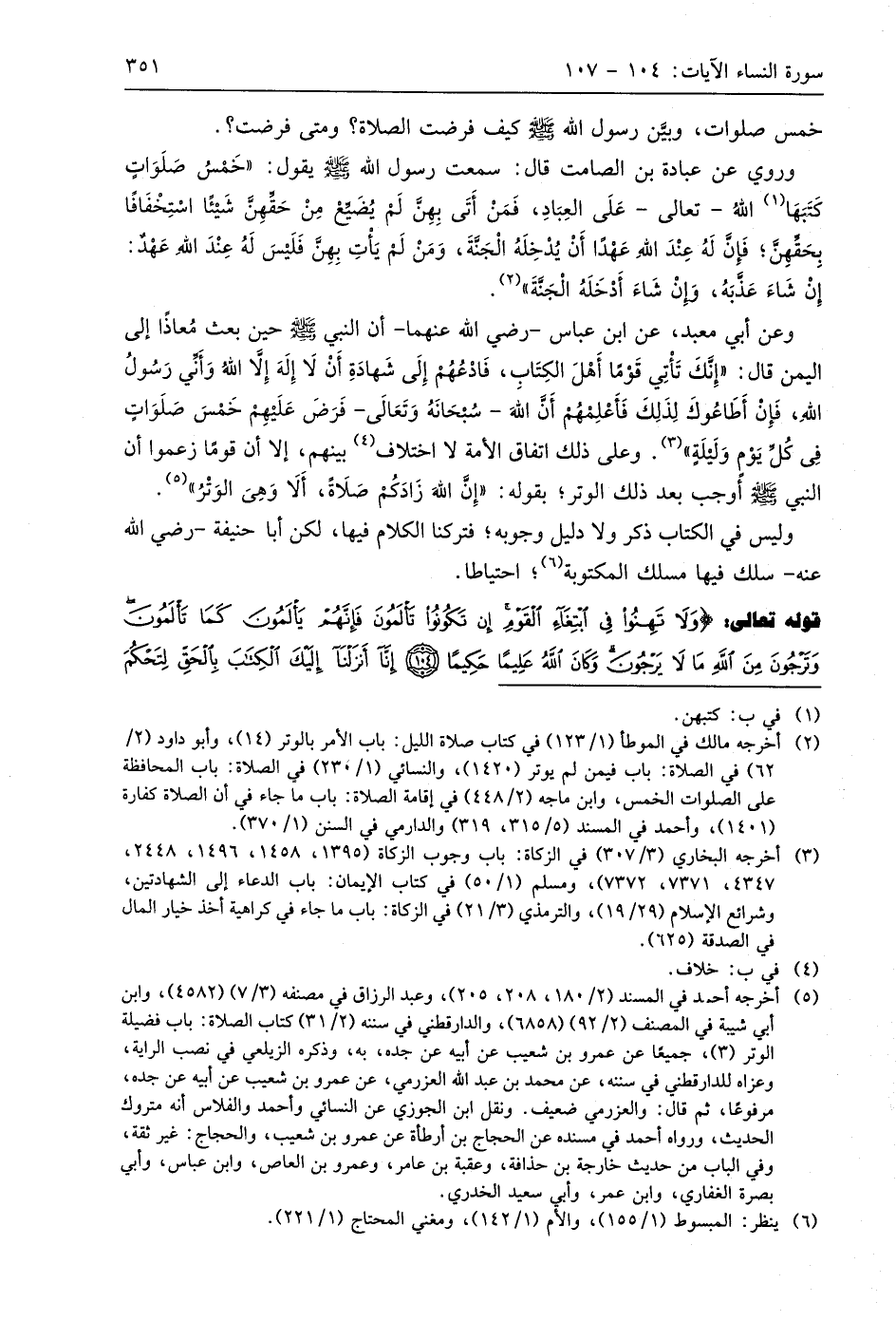وعن أبي معبد، عن ابن عَبَّاسٍ - رضي اللَّه عنهما - أن النبي - صَلَّى اللَّهُ عَلَيهِ وَسَلَّمَ - حين بعث مُعاذًا إلى اليمن قال: " إِنَكَ تَأْتِي قَوْمًا أَهْلَ الكِتَابِ، فَادْعُهُم إِلَى شَهادَةِ أَنْ لَا إِلَهَ إِلا اللَّهُ وَأَني رَسُولُ اللَّهَ، فَإِنْ أَطَاعُوكَ لِذَلِكَ فَأعْلِمْهُم أَن اللَّهَ - سُبحَانَهُ وَتَعَالَى - فَرَضَ عَلَيهِمْ خَمْسَ صَلَوَاتٍ فِي كُل يَوْمٍ وَلَيلَةٍ ". وعلى ذلك اتفاق الأمة لا اختلاف بينهم، إلا أن قومًا زعموا أن النبي - صَلَّى اللَّهُ عَلَيهِ وَسَلَّمَ - أوجب بعد ذلك الوتر؛ بقوله: " إِنَّ اللَّهَ زَادَكُمْ صَلَاةً، ألَا وَهِيَ الوَتْرُ ".