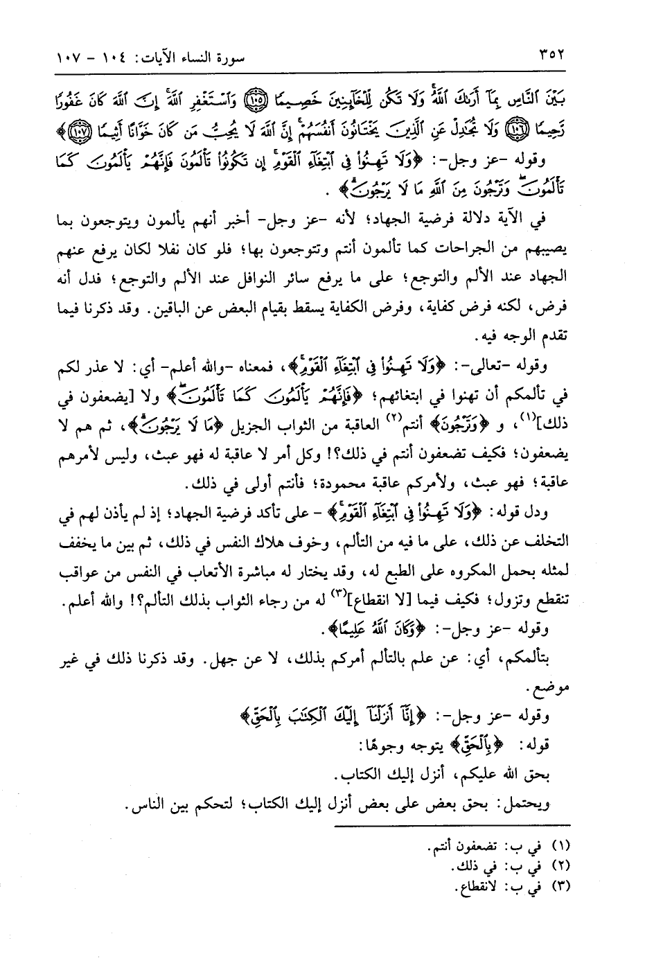 وقوله - عَزَّ وَجَلَّ -: (وَلَا تَهِنُوا فِي ابْتِغَاءِ الْقَوْمِ إِنْ تَكُونُوا تَأْلَمُونَ فَإِنَّهُمْ يَأْلَمُونَ كَمَا تَأْلَمُونَ وَتَرْجُونَ مِنَ اللَّهِ مَا لَا يَرْجُونَ ... (104)