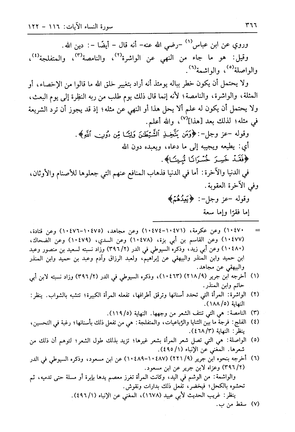 ولا يحتمل أن يكون خطر بباله يومئذ أنه أراد بتغيير خلق اللَّه ما قالوا من الإخصاء، أو المثلة، والواشرة، والنامصة؛ لأنه إنما قال ذلك يوم طلب من ربه النظِرة إلى يوم البعث، ولا يحتمل أن يكون له علم ألا يحل هذا أو النهي عن مثله؛ إذ قد يجوز أن ترد الشريعة في مثله؛ لذلك بعد هذا، واللَّه أعلم.