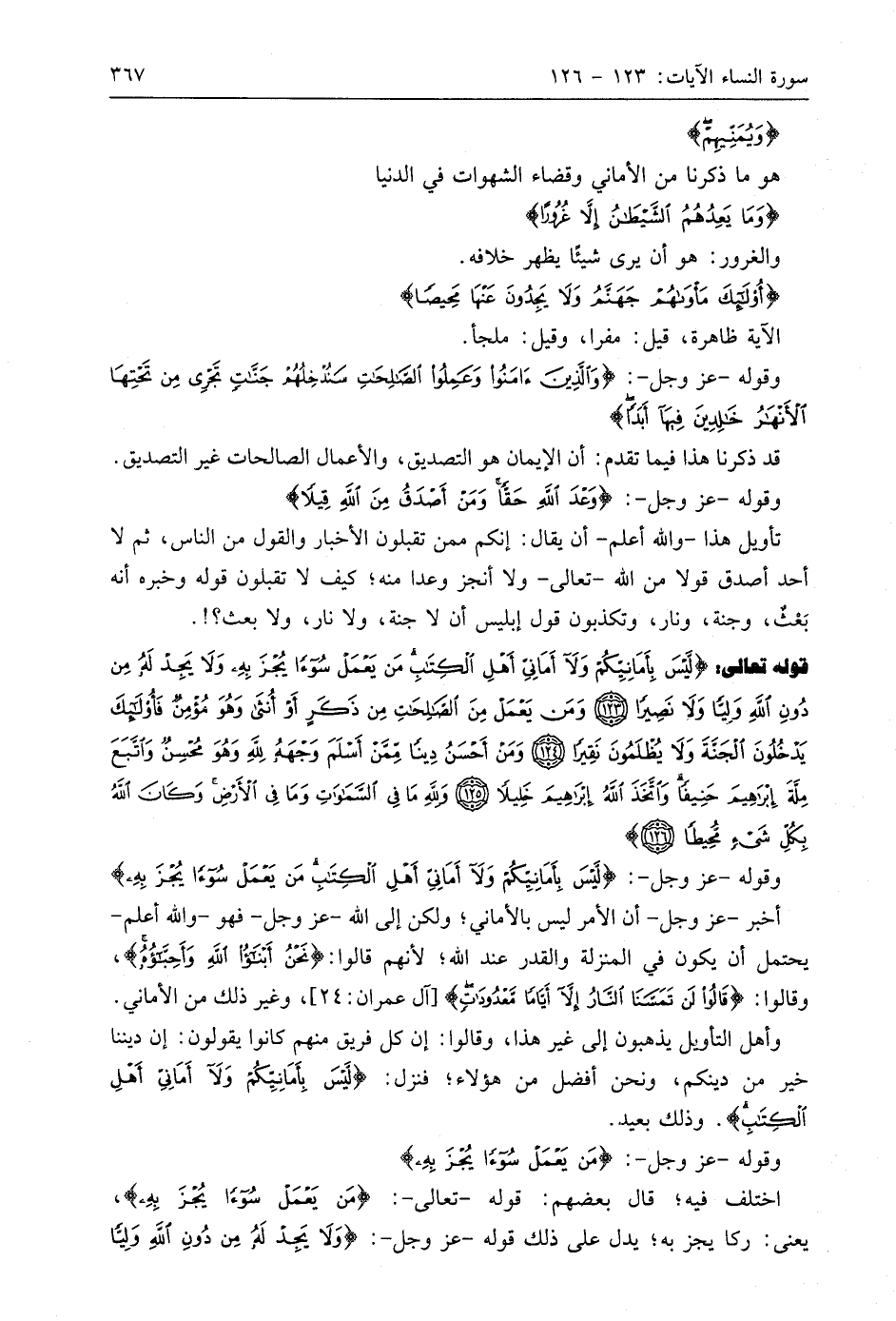 قوله تعالى: (لَيْسَ بِأَمَانِيِّكُمْ وَلَا أَمَانِيِّ أَهْلِ الْكِتَابِ مَنْ يَعْمَلْ سُوءًا يُجْزَ بِهِ وَلَا يَجِدْ لَهُ مِنْ دُونِ اللَّهِ وَلِيًّا وَلَا نَصِيرًا (123) وَمَنْ يَعْمَلْ مِنَ الصَّالِحَاتِ مِنْ ذَكَرٍ أَوْ أُنْثَى وَهُوَ مُؤْمِنٌ فَأُولَئِكَ يَدْخُلُونَ الْجَنَّةَ وَلَا يُظْلَمُونَ نَقِيرًا (124) وَمَنْ أَحْسَنُ دِينًا مِمَّنْ أَسْلَمَ وَجْهَهُ لِلَّهِ وَهُوَ مُحْسِنٌ وَاتَّبَعَ مِلَّةَ إِبْرَاهِيمَ حَنِيفًا وَاتَّخَذَ اللَّهُ إِبْرَاهِيمَ خَلِيلًا (125) وَلِلَّهِ مَا فِي السَّمَاوَاتِ وَمَا فِي الْأَرْضِ وَكَانَ اللَّهُ بِكُلِّ شَيْءٍ مُحِيطًا (126)