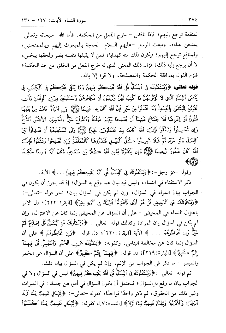 قوله تعالى: (وَيَسْتَفْتُونَكَ فِي النِّسَاءِ قُلِ اللَّهُ يُفْتِيكُمْ فِيهِنَّ وَمَا يُتْلَى عَلَيْكُمْ فِي الْكِتَابِ فِي يَتَامَى النِّسَاءِ اللَّاتِي لَا تُؤْتُونَهُنَّ مَا كُتِبَ لَهُنَّ وَتَرْغَبُونَ أَنْ تَنْكِحُوهُنَّ وَالْمُسْتَضْعَفِينَ مِنَ الْوِلْدَانِ وَأَنْ تَقُومُوا لِلْيَتَامَى بِالْقِسْطِ وَمَا تَفْعَلُوا مِنْ خَيْرٍ فَإِنَّ اللَّهَ كَانَ بِهِ عَلِيمًا (127) وَإِنِ امْرَأَةٌ خَافَتْ مِنْ بَعْلِهَا نُشُوزًا أَوْ إِعْرَاضًا فَلَا جُنَاحَ عَلَيْهِمَا أَنْ يُصْلِحَا بَيْنَهُمَا صُلْحًا وَالصُّلْحُ خَيْرٌ وَأُحْضِرَتِ الْأَنْفُسُ الشُّحَّ وَإِنْ تُحْسِنُوا وَتَتَّقُوا فَإِنَّ اللَّهَ كَانَ بِمَا تَعْمَلُونَ خَبِيرًا (128) وَلَنْ تَسْتَطِيعُوا أَنْ تَعْدِلُوا بَيْنَ النِّسَاءِ وَلَوْ حَرَصْتُمْ فَلَا تَمِيلُوا كُلَّ الْمَيْلِ فَتَذَرُوهَا كَالْمُعَلَّقَةِ وَإِنْ تُصْلِحُوا وَتَتَّقُوا فَإِنَّ اللَّهَ كَانَ غَفُورًا رَحِيمًا (129) وَإِنْ يَتَفَرَّقَا يُغْنِ اللَّهُ كُلًّا مِنْ سَعَتِهِ وَكَانَ اللَّهُ وَاسِعًا حَكِيمًا (130)