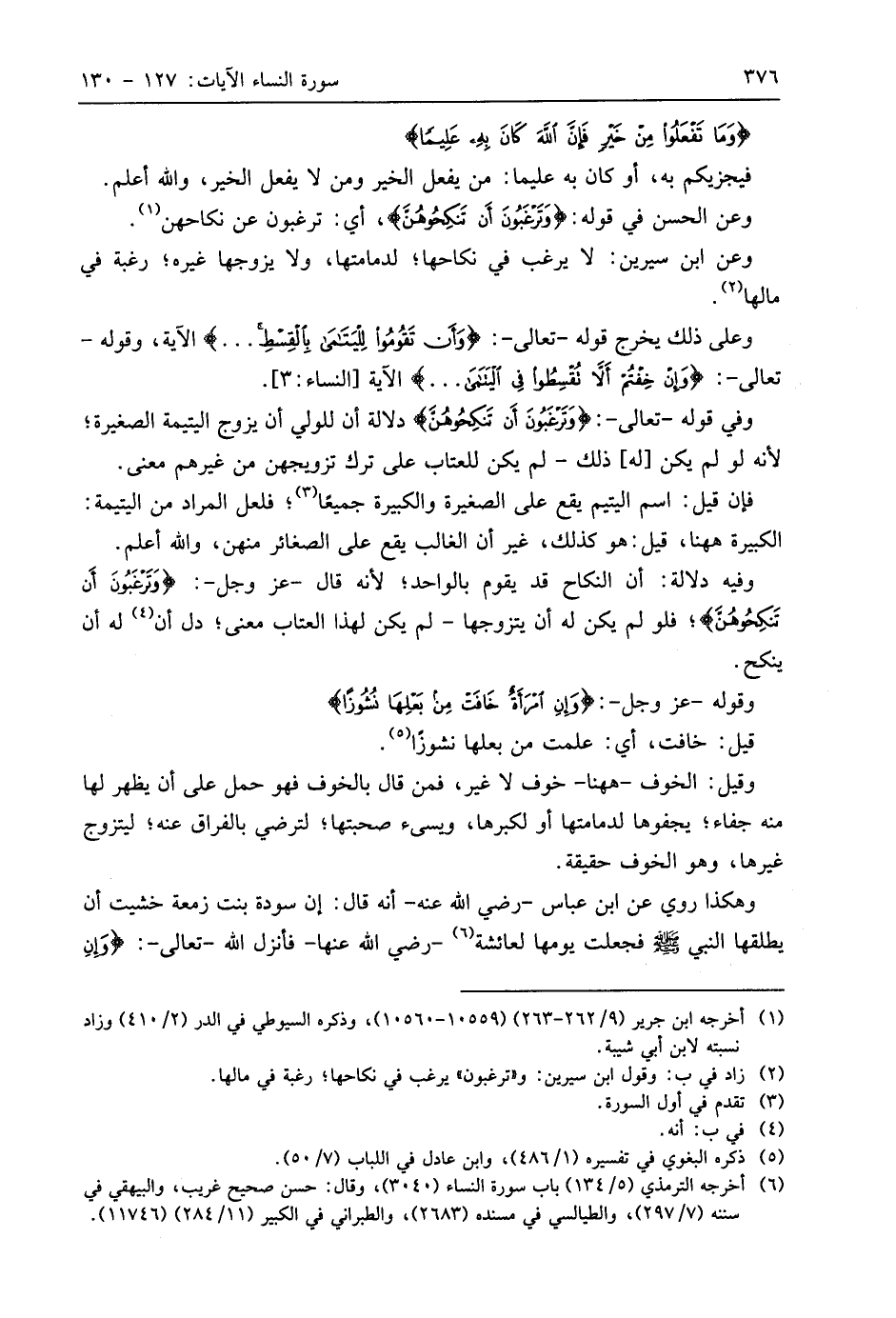 وهكذا روي عن ابن عَبَّاسٍ - رَضِيَ اللَّهُ عَنْهُ - أنه قال: [إنَّ سَوْدَةَ بِنْتَ زَمْعَةَ خشيت أن يطلقها النبي - صَلَّى اللَّهُ عَلَيهِ وَسَلَّمَ - فجعلت يومها لعائشة - رضي اللَّه عنها - فأنزل اللَّه - تعالى] (¬1): (وَإنِ