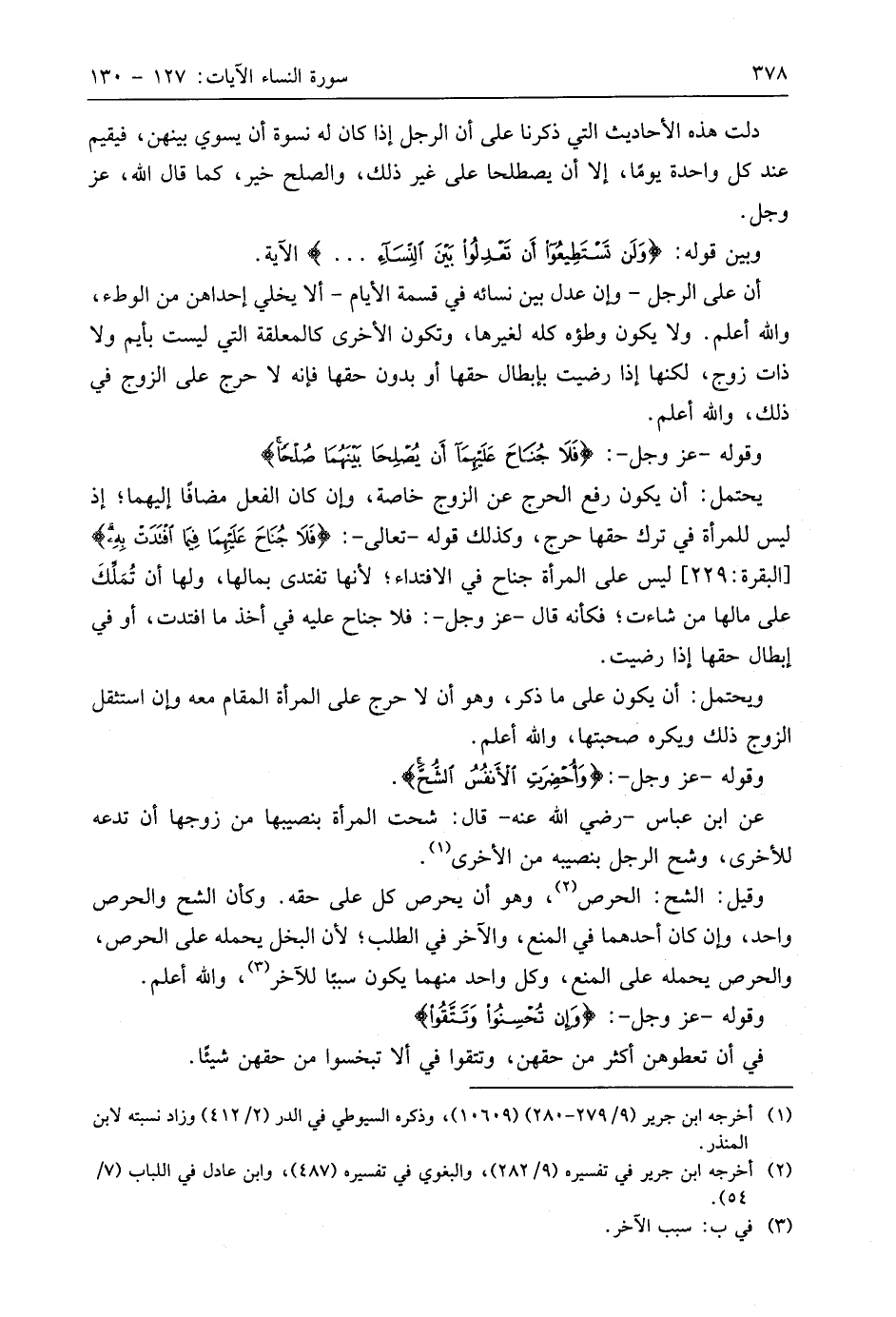 عن ابن عَبَّاسٍ - رَضِيَ اللَّهُ عَنْهُ - قال: شحت المرأة بنصيبها من زوجها أن تدعه للأخرى، وشح الرجل بنصيبه من الأخرى.