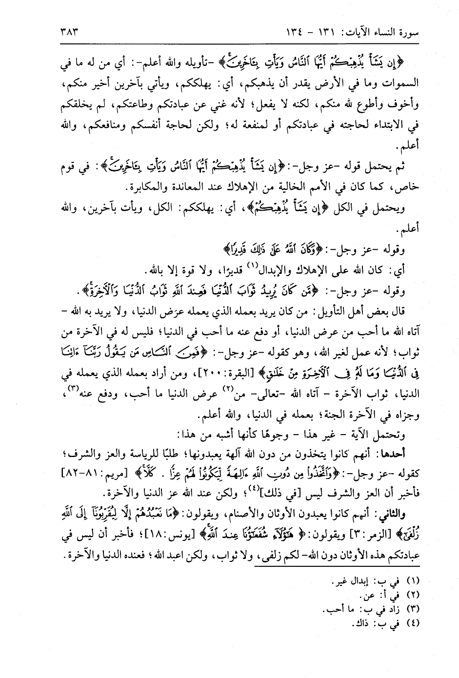 (إِنْ يَشَأْ يُذْهِبْكُمْ أَيُّهَا النَّاسُ وَيَأْتِ بِآخَرِينَ ... (133) تأويله واللَّه أعلم -: أي من له ما في السماوات وما في الأرض يقدر أن يذهبكم، أي: يهلككم، ويأتي بآخرين أخير منكم، وأخوف وأطوع لله منكم، لكنه لا يفعل؛ لأنه غني عن عبادتكم وطاعتكم، لم يخلقكم في الابتداء لحاجته في عبادتكم أو لمنفعة له؛ ولكن لحاجة أنفسكم ومنافعكم، واللَّه أعلم.