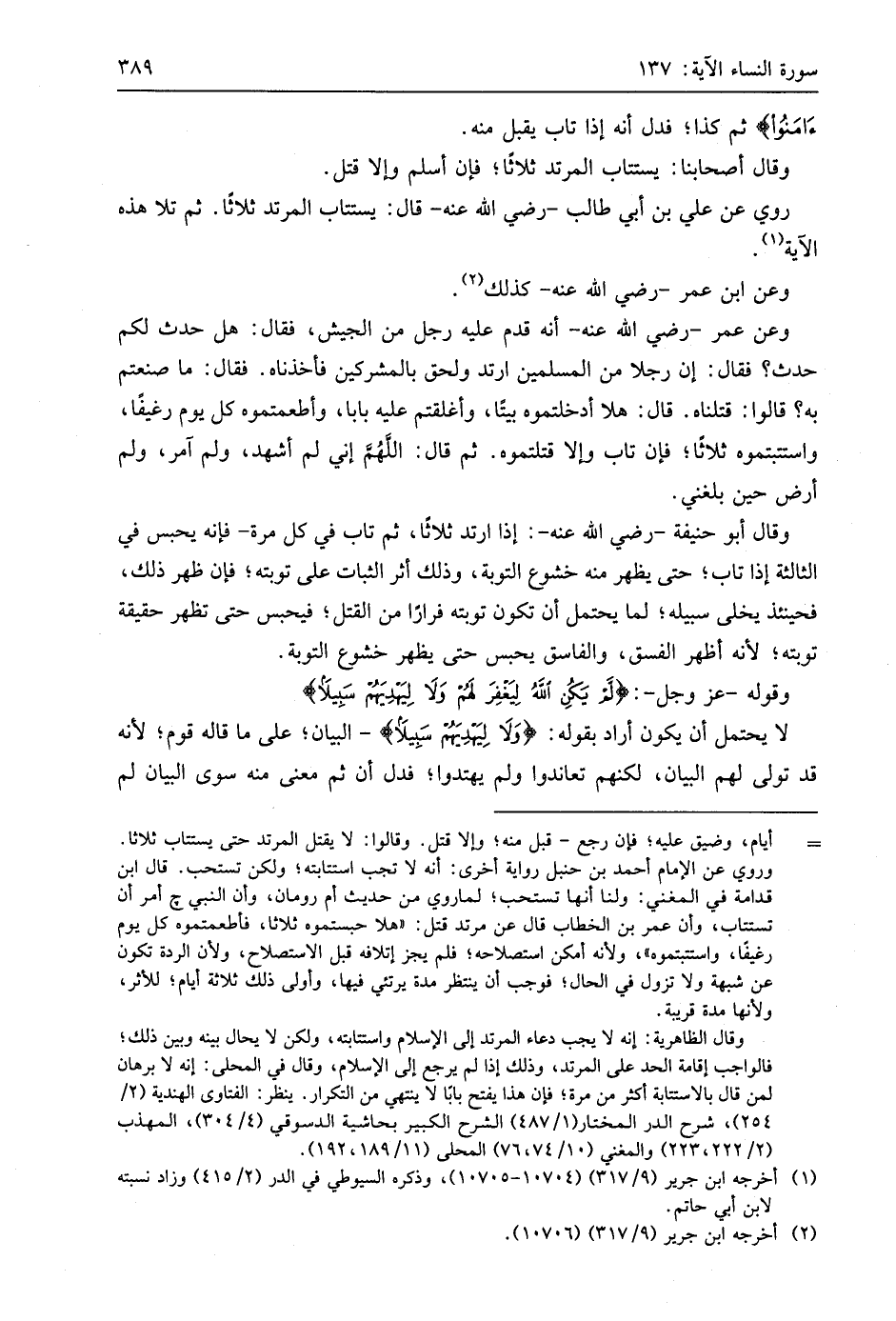 روي عن علي بن أبي طالب - رضي اللَّه عنه - قال: يستتاب المرتد ثلاثًا. ثم تلا هذه الآية.