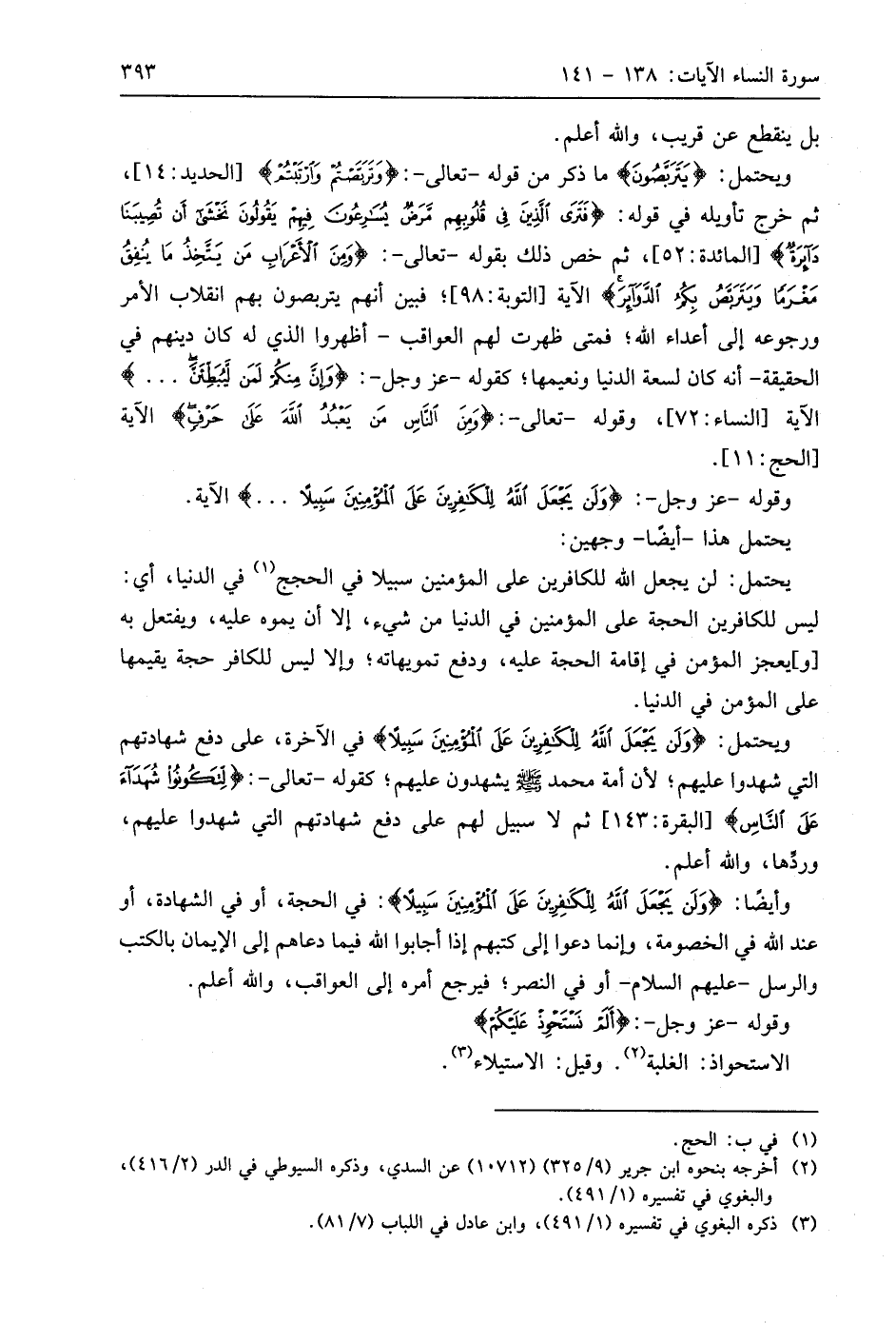 وقوله - عَزَّ وَجَلَّ -: (وَلَنْ يَجْعَلَ اللَّهُ لِلْكَافِرِينَ عَلَى الْمُؤْمِنِينَ سَبِيلًا) الآية.