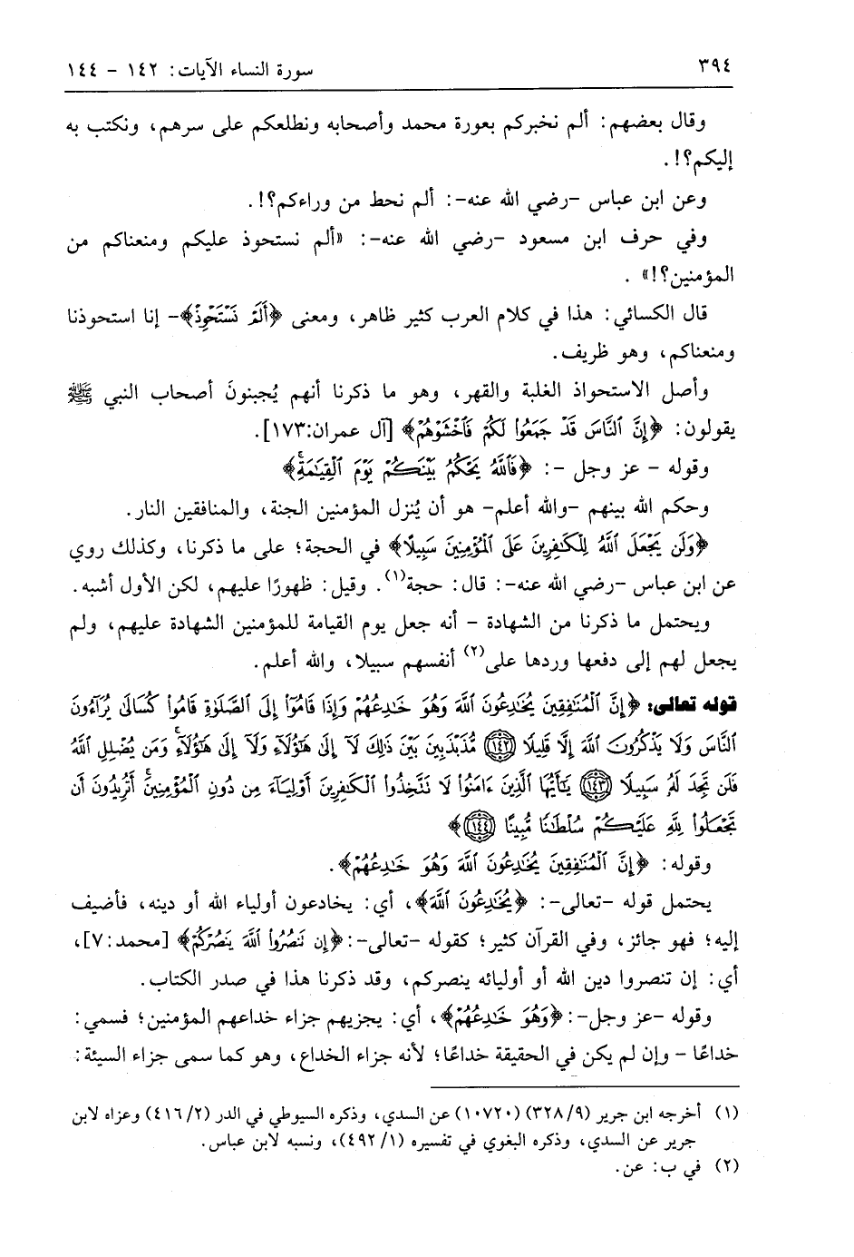 قوله تعالى: (إِنَّ الْمُنَافِقِينَ يُخَادِعُونَ اللَّهَ وَهُوَ خَادِعُهُمْ وَإِذَا قَامُوا إِلَى الصَّلَاةِ قَامُوا كُسَالَى يُرَاءُونَ النَّاسَ وَلَا يَذْكُرُونَ اللَّهَ إِلَّا قَلِيلًا (142) مُذَبْذَبِينَ بَيْنَ ذَلِكَ لَا إِلَى هَؤُلَاءِ وَلَا إِلَى هَؤُلَاءِ وَمَنْ يُضْلِلِ اللَّهُ فَلَنْ تَجِدَ لَهُ سَبِيلًا (143) يَا أَيُّهَا الَّذِينَ آمَنُوا لَا تَتَّخِذُوا الْكَافِرِينَ أَوْلِيَاءَ مِنْ دُونِ الْمُؤْمِنِينَ أَتُرِيدُونَ أَنْ تَجْعَلُوا لِلَّهِ عَلَيْكُمْ سُلْطَانًا مُبِينًا (144)