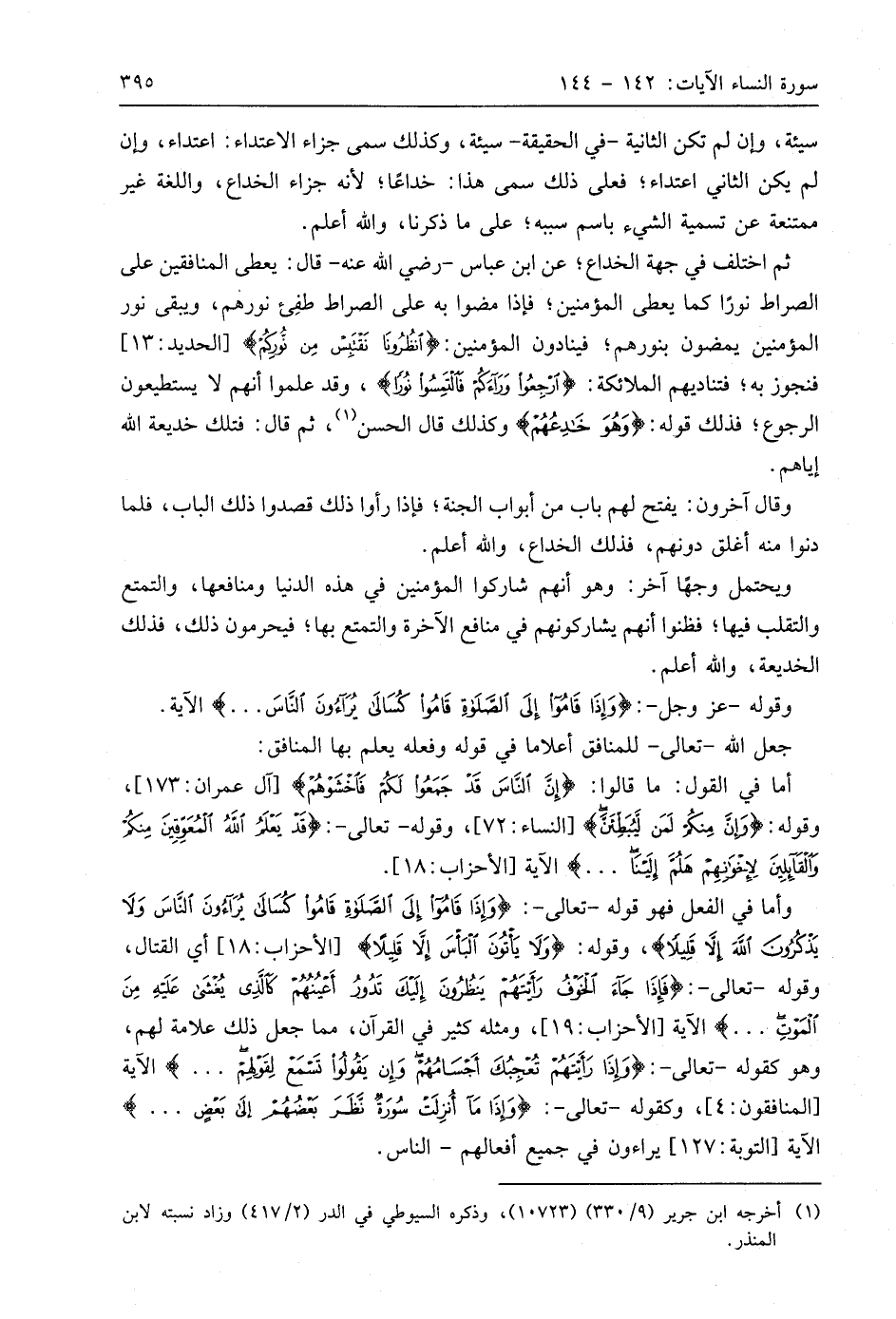 وأما في الفعل فهو قوله - تعالى -: (وَإِذَا قَامُوا إِلَى الصَّلَاةِ قَامُوا كُسَالَى يُرَاءُونَ النَّاسَ وَلَا يَذْكُرُونَ اللَّهَ إِلَّا قَلِيلًا)، وقوله: (وَلَا يَأْتُونَ الْبَأْسَ إِلَّا قَلِيلًا)، أي القتال، وقوله - تعالى -: (فَإِذَا جَاءَ الْخَوْفُ رَأَيْتَهُمْ يَنْظُرُونَ إِلَيْكَ تَدُورُ أَعْيُنُهُمْ كَالَّذِي يُغْشَى عَلَيْهِ مِنَ الْمَوْتِ. . .) الآية، ومثله كثير في القرآن، مما جعل ذلك علامة لهم، وهو كقوله - تعالى -: (وَإِذَا رَأَيْتَهُمْ تُعْجِبُكَ أَجْسَامُهُمْ وَإِنْ يَقُولُوا تَسْمَعْ لِقَوْلِهِمْ. . .) الآية، وكقوله - تعالى -: (وَإِذَا مَا أُنْزِلَتْ سُورَةٌ نَظَرَ بَعْضُهُمْ إِلَى بَعْضٍ. . .) الآية، يراءون في جميع أفعالهم - الناس.