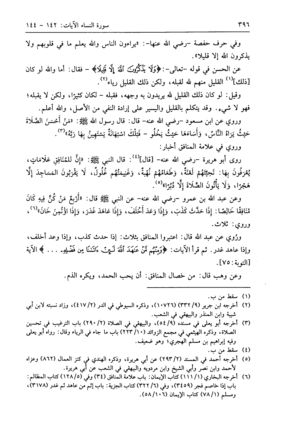 عن الحسن في قوله - تعالى -: (وَلَا يَذْكُرُونَ اللَّهَ إِلَّا قَلِيلًا) - فقال: أما واللَّه لو كان ذلك القليل منهم للَّهِ لقبله، ولكن ذلك القليل رياء.