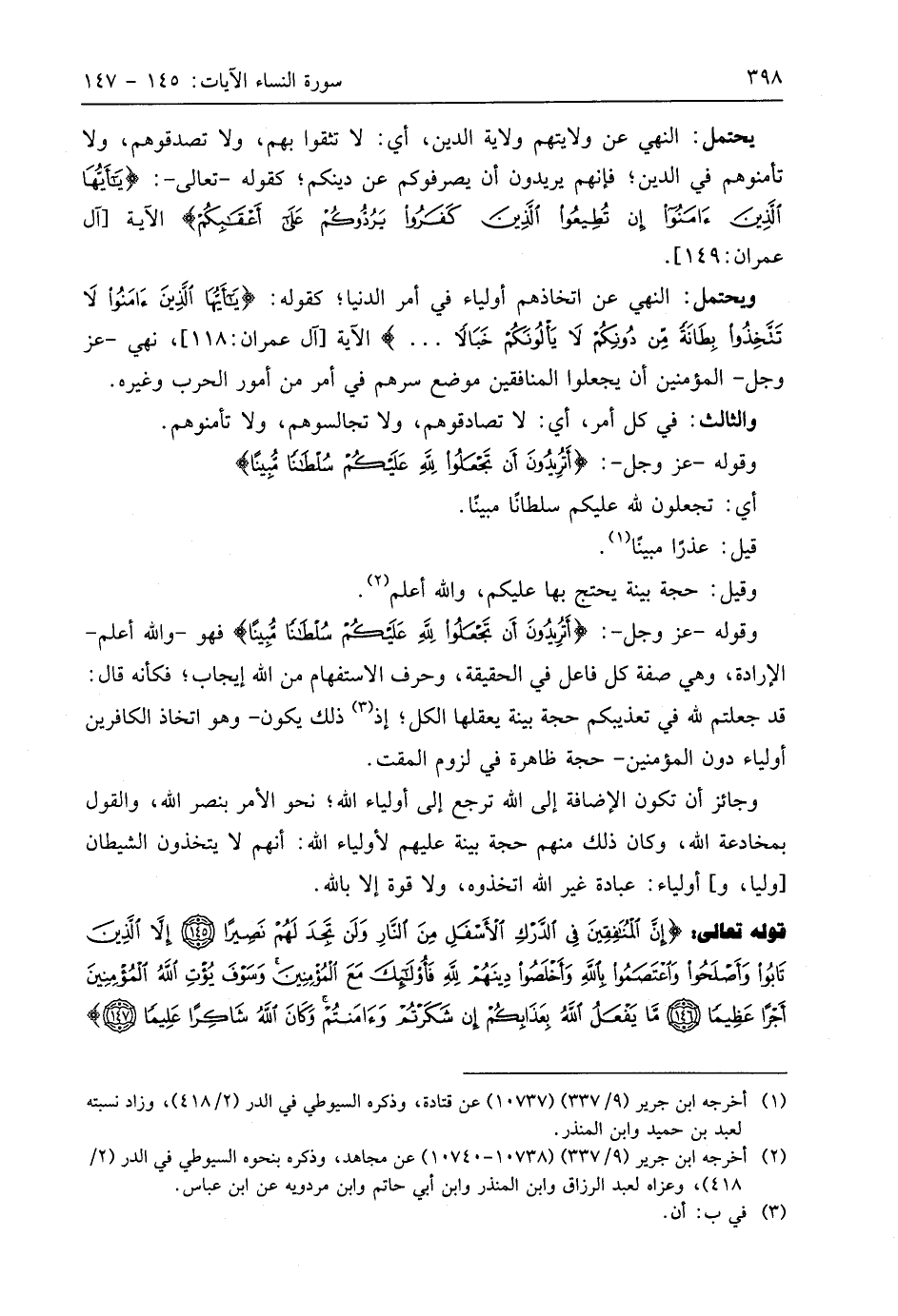 وقوله - عَزَّ وَجَلَّ -: (أَتُرِيدُونَ أَنْ تَجْعَلُوا لِلَّهِ عَلَيْكُمْ سُلْطَانًا مُبِينًا) فهو - واللَّه أعلم - الإرادة، وهي صفة كل فاعل في الحقيقة، وحرف الاستفهام من اللَّه إيجاب؛ فكأنه قال: قد جعلتم لله في تعذيبكم حجة بينة يعقلها الكل؛ إذ ذلك يكون - وهو اتخاذ الكافرين أولياء دون المؤمنين - حجة ظاهرة في لزوم المقت.