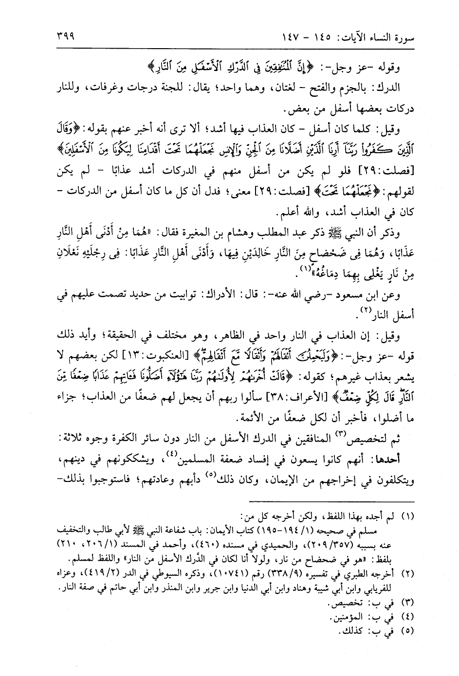 وقوله - عَزَّ وَجَلَّ -: (إِنَّ الْمُنَافِقِينَ فِي الدَّرْكِ الْأَسْفَلِ مِنَ النَّارِ ... (145)