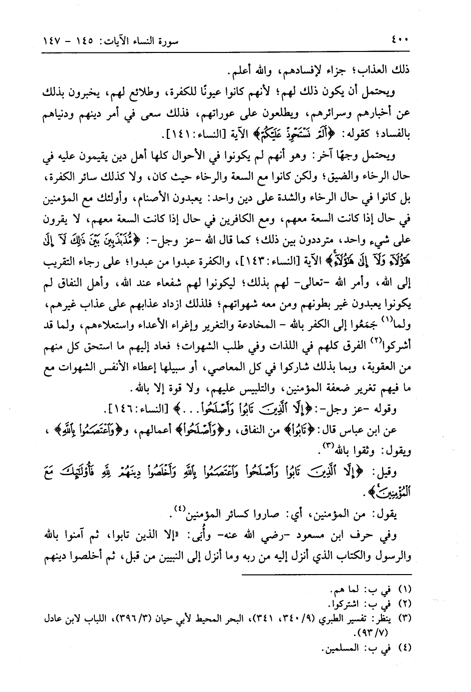 وقوله - عَزَّ وَجَلَّ -: (إِلَّا الَّذِينَ تَابُوا وَأَصْلَحُوا ... (146)