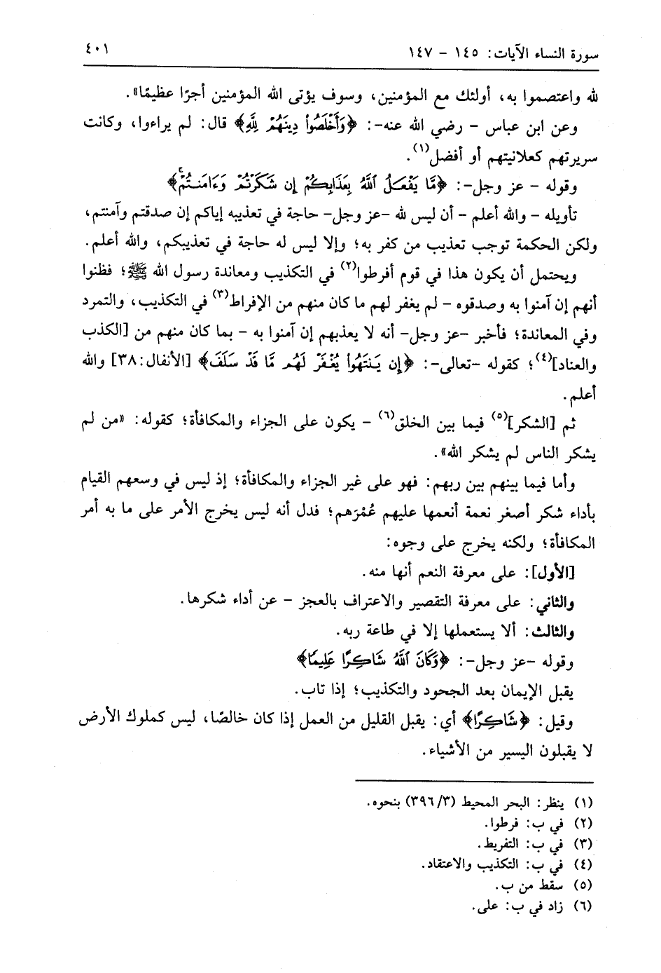 وقوله - عَزَّ وَجَلَّ -: (مَا يَفْعَلُ اللَّهُ بِعَذَابِكُمْ إِنْ شَكَرْتُمْ وَآمَنْتُمْ ... (147)