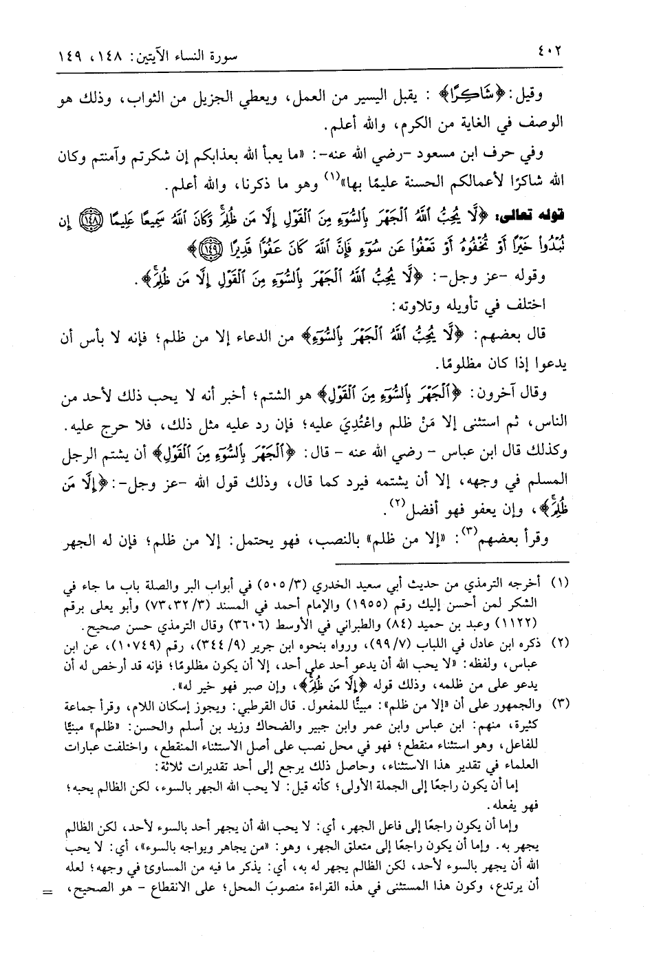 وكذلك قال ابن عَبَّاسٍ - رَضِيَ اللَّهُ عَنْهُ - قال: (لَا يُحِبُّ اللَّهُ الْجَهْرَ بِالسُّوءِ مِنَ الْقَوْلِ) أن يشتم الرجل المسلم في وجهه، إلا أن يشتمه فيرد كما قال، وذلك قول اللَّه - عَزَّ وَجَلَّ -: (إِلَّا مَنْ ظُلِمَ)، وإن يعفو فهو أفضل.