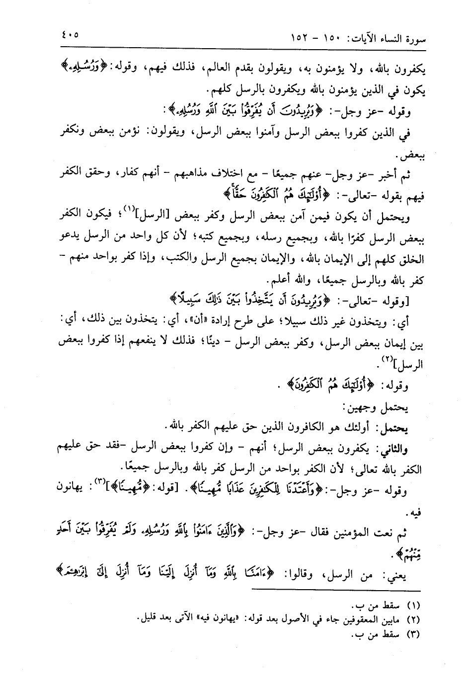 ثم نعت المؤمنين فقال - عَزَّ وَجَلَّ -: (وَالَّذِينَ آمَنُوا بِاللَّهِ وَرُسُلِهِ وَلَمْ يُفَرِّقُوا بَيْنَ أَحَدٍ مِنْهُمْ ... (152)