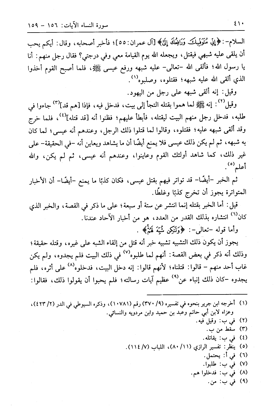 وقيل: إنه - صَلَّى اللَّهُ عَلَيهِ وَسَلَّمَ - لما هموا بقتله التجأ إلى بيت، فدخل فيه، فإذا هم قد جاءوا في طلبه، فدخل رجل منهم البيت ليقتله، فأبطأ عليهم؛ فظنوا أنه قد قتله، فلما خرج وقد أُلقي شبهه عليه؛ فقتلوه، وقالوا لما قتلوا ذلك الرجل، وعندهم أنه عيسى؛ لما كان به شبهه، ثم لم يكن ذلك عيسى فلا يمنع أيضًا أن ما يشاهد ويعاين أنه -في الحقيقة- على غير ذلك، كما شاهد أُولَئِكَ القوم وعاينوا، وعندهم أنه عيسى، ثم لم يكن، واللَّه أعلم.