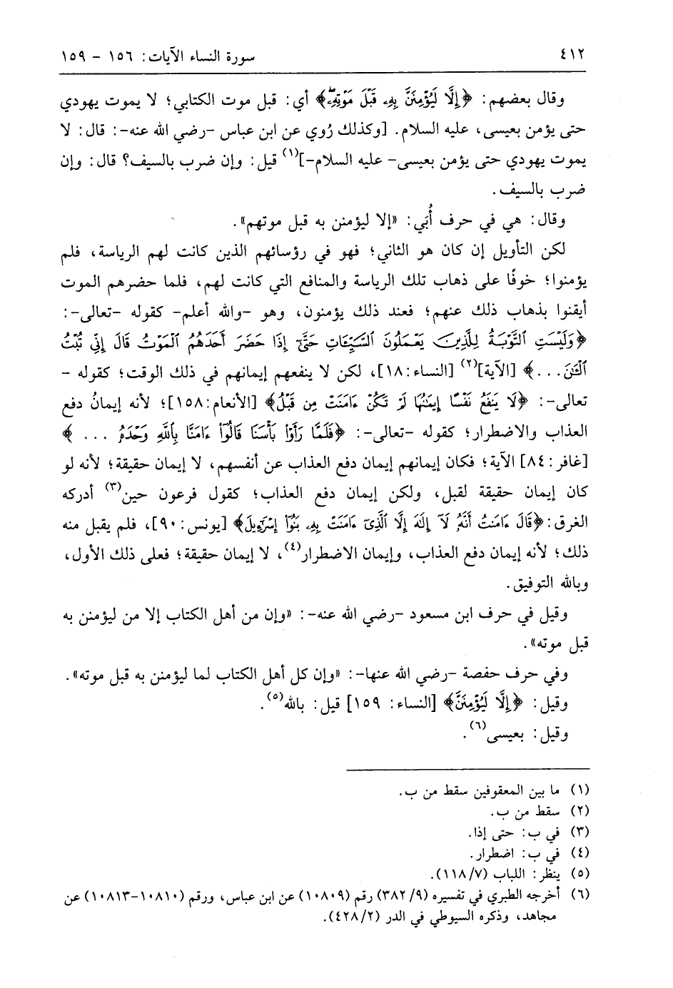 وقَالَ بَعْضُهُمْ: (إِلَّا لَيُؤْمِنَنَّ بِهِ قَبْلَ مَوْتِهِ) أي: قبل موت الكتابي؛ لا يموت يهودي حتى يؤمن بعيسى، عليه السلام. وكذلك رُوي عن ابن عَبَّاسٍ - رضي اللَّه عنه -: قال: لا يموت يهودي حتى يؤمن بعيسى - عليه السلام -، قيل: وإن ضرب بالسيف؟ قال: وإن ضرب بالسيف.