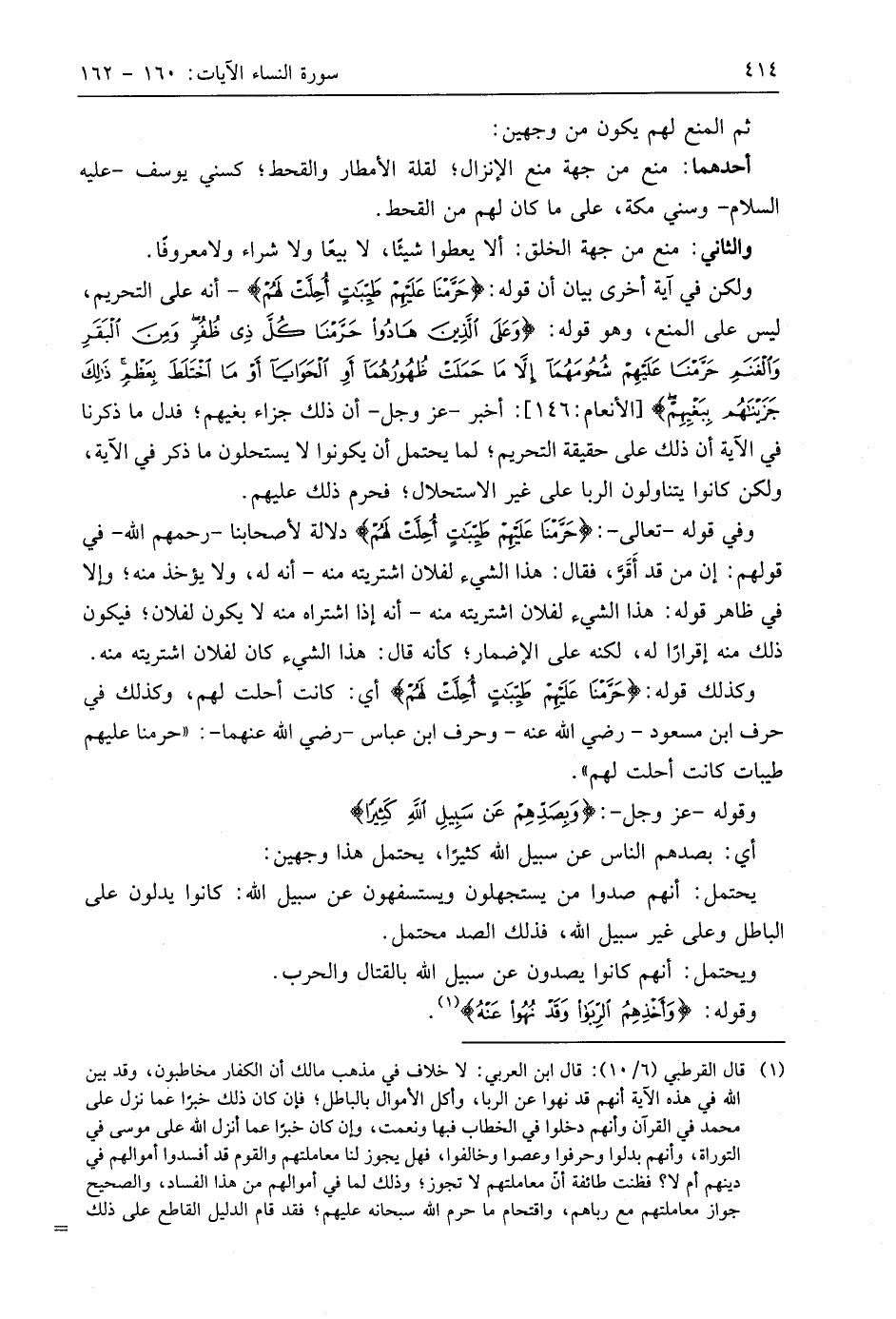 ولكن في آية أخرى بيان أن قوله: (حَرَّمْنَا عَلَيْهِمْ طَيِّبَاتٍ أُحِلَّتْ لَهُمْ) - أنه على التحريم، ليس على المنع، وهو قوله: (وَعَلَى الَّذِينَ هَادُوا حَرَّمْنَا كُلَّ ذِي ظُفُرٍ وَمِنَ الْبَقَرِ وَالْغَنَمِ حَرَّمْنَا عَلَيْهِمْ شُحُومَهُمَا إِلَّا مَا حَمَلَتْ ظُهُورُهُمَا أَوِ الْحَوَايَا أَوْ مَا اخْتَلَطَ بِعَظْمٍ ذَلِكَ جَزَيْنَاهُمْ بِبَغْيِهِمْ): أخبر - عَزَّ وَجَلَّ - أن ذلك جزاء بغيهم؛ فدل ما ذكرنا في الآية أن ذلك على حقيقة التحريم؛ لما يحتمل أن يكونوا لا يستحلون ما ذكر في الآية، ولكن كانوا يتناولون الربا على غير الاستحلال؛ فحرم ذلك عليهم.