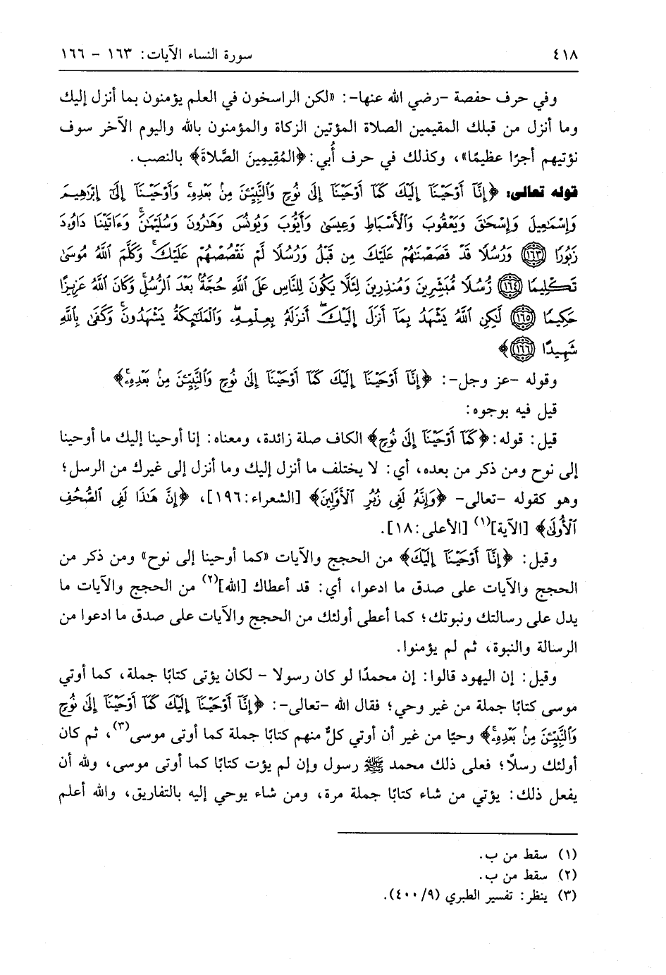وقوله - عَزَّ وَجَلَّ -: (إِنَّا أَوْحَيْنَا إِلَيْكَ كَمَا أَوْحَيْنَا إِلَى نُوحٍ وَالنَّبِيِّينَ مِنْ بَعْدِهِ)