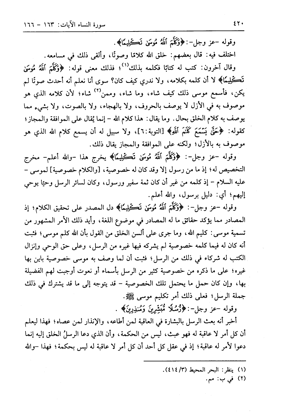 وقوله - عَزَّ وَجَلَّ -: (وَكَلَّمَ اللَّهُ مُوسَى تَكْلِيمًا) دل المصدر على تحقيق الكلام؛ إذ المصادر مما يؤكد حقائق ما له المصادر في موضوع اللغة، وأيد ذلك الأمر المشهور من تسمية موسى: كليم اللَّه، وما جرى على ألسن الخلق من القول بأن اللَّه كلم موسى؛ فثبت أنه كان له فيما كلمه خصوصية لم يشركه فيها غيره من الرسل، وعلى حق الوحي لمانزال الكتب له شركاء في ذلك من الرسل؛ فثبت أن لما وصف به موسى خصوصية بايَنَ بها غيره؛ على ما ذكره من خصوصية كثير من الرسل بأسماء أو نعوت أوجبت لهم الفضيلة بها، وإن كان حمل ما يحتمل تلك الخصوصية - قد يتوجه إلى ما قد يشترك في ذلك جملة الرسل؛ فعلى ذلك أمر تكليم موسى - صَلَّى اللَّهُ عَلَيهِ وَسَلَّمَ -.