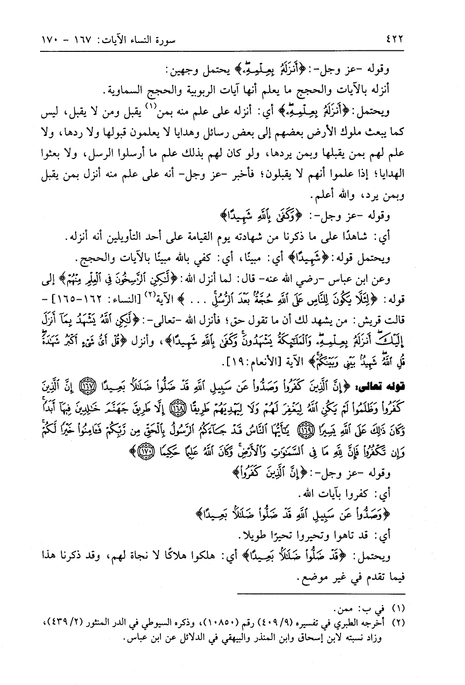 وقوله - عَزَّ وَجَلَّ -: (وَكَفَى بِاللَّهِ شَهِيدًا)