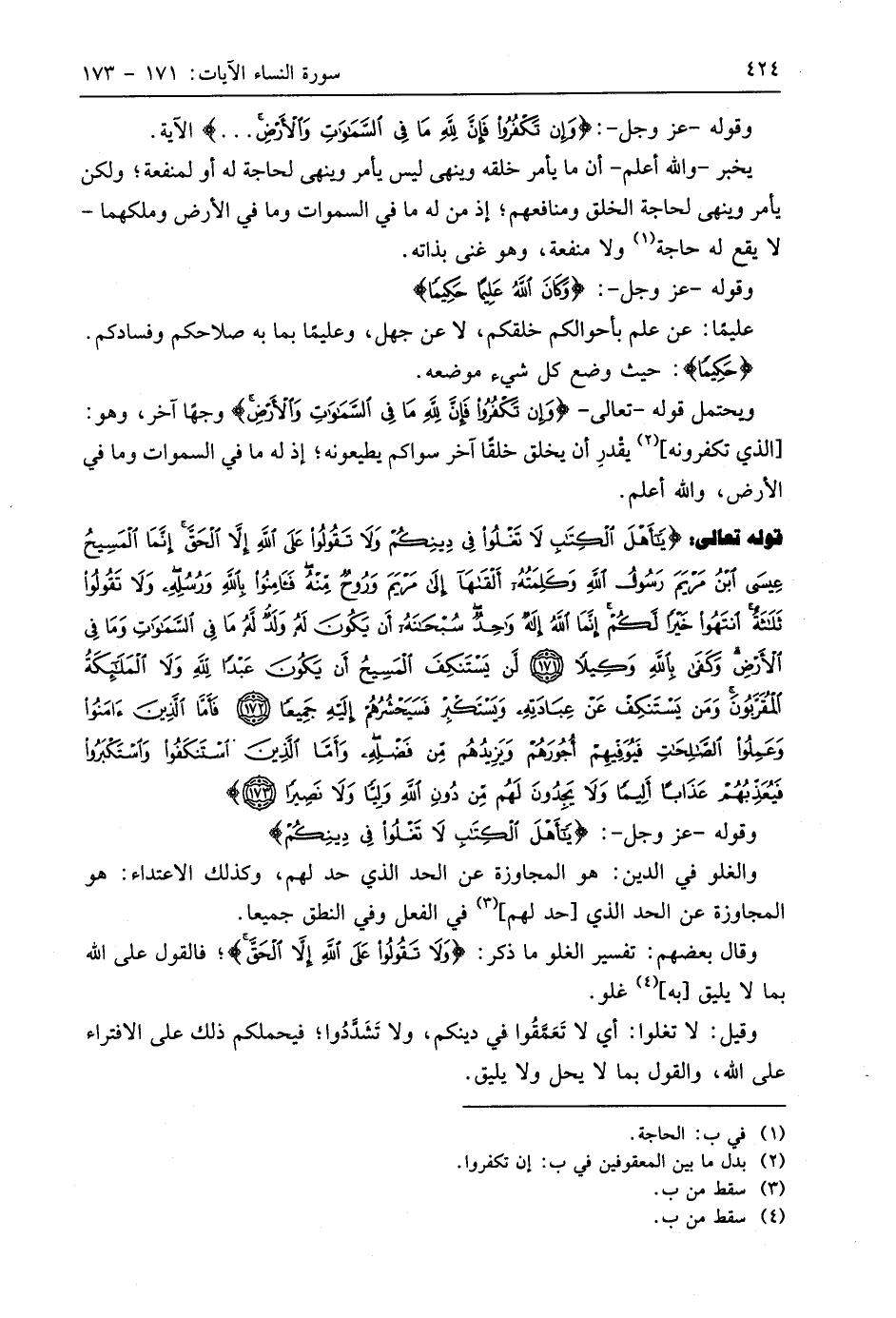 قوله تعالى: (يَا أَهْلَ الْكِتَابِ لَا تَغْلُوا فِي دِينِكُمْ وَلَا تَقُولُوا عَلَى اللَّهِ إِلَّا الْحَقَّ إِنَّمَا الْمَسِيحُ عِيسَى ابْنُ مَرْيَمَ رَسُولُ اللَّهِ وَكَلِمَتُهُ أَلْقَاهَا إِلَى مَرْيَمَ وَرُوحٌ مِنْهُ فَآمِنُوا بِاللَّهِ وَرُسُلِهِ وَلَا تَقُولُوا ثَلَاثَةٌ انْتَهُوا خَيْرًا لَكُمْ إِنَّمَا اللَّهُ إِلَهٌ وَاحِدٌ سُبْحَانَهُ أَنْ يَكُونَ لَهُ وَلَدٌ لَهُ مَا فِي السَّمَاوَاتِ وَمَا فِي الْأَرْضِ وَكَفَى بِاللَّهِ وَكِيلًا (171) لَنْ يَسْتَنْكِفَ الْمَسِيحُ أَنْ يَكُونَ عَبْدًا لِلَّهِ وَلَا الْمَلَائِكَةُ الْمُقَرَّبُونَ وَمَنْ يَسْتَنْكِفْ عَنْ عِبَادَتِهِ وَيَسْتَكْبِرْ فَسَيَحْشُرُهُمْ إِلَيْهِ جَمِيعًا (172) فَأَمَّا الَّذِينَ آمَنُوا وَعَمِلُوا الصَّالِحَاتِ فَيُوَفِّيهِمْ أُجُورَهُمْ وَيَزِيدُهُمْ مِنْ فَضْلِهِ وَأَمَّا الَّذِينَ اسْتَنْكَفُوا وَاسْتَكْبَرُوا فَيُعَذِّبُهُمْ عَذَابًا أَلِيمًا وَلَا يَجِدُونَ لَهُمْ مِنْ دُونِ اللَّهِ وَلِيًّا وَلَا نَصِيرًا (173)
