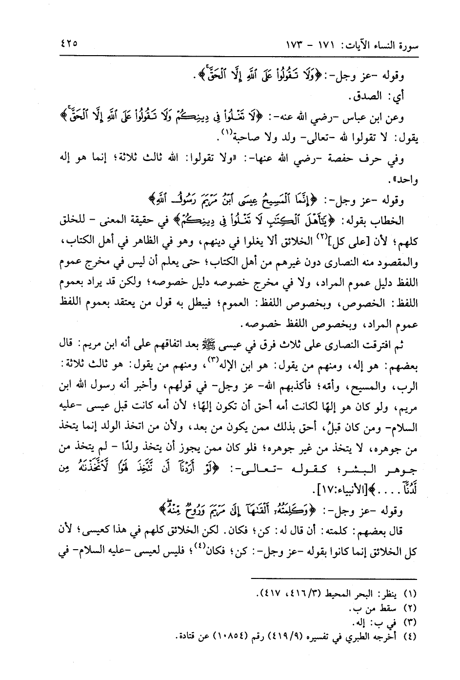الخطاب بقوله: (يَا أَهْلَ الْكِتَابِ لَا تَغْلُوا فِي دِينِكُمْ) في حقيقة المعنى - للخلق كلهم؛ لأن على كل الخلائق ألا يغلوا في دينهم، وهو في الظاهر في أهل الكتاب، والمقصود منه النصارى دون غيرهم من أهل الكتاب؛ حتى يعلم أن ليس في مخرج عموم اللفظ دليل عموم المراد، ولا في مخرج خصوصه دليل خصوصه؛ ولكن قد يراد بعموم اللفظ: الخصوص، وبخصوص اللفظ: العموم؛ فيبطل به قول من يعتقد بعموم اللفظ عموم المراد، وبخصوص اللفظ خصوصه.