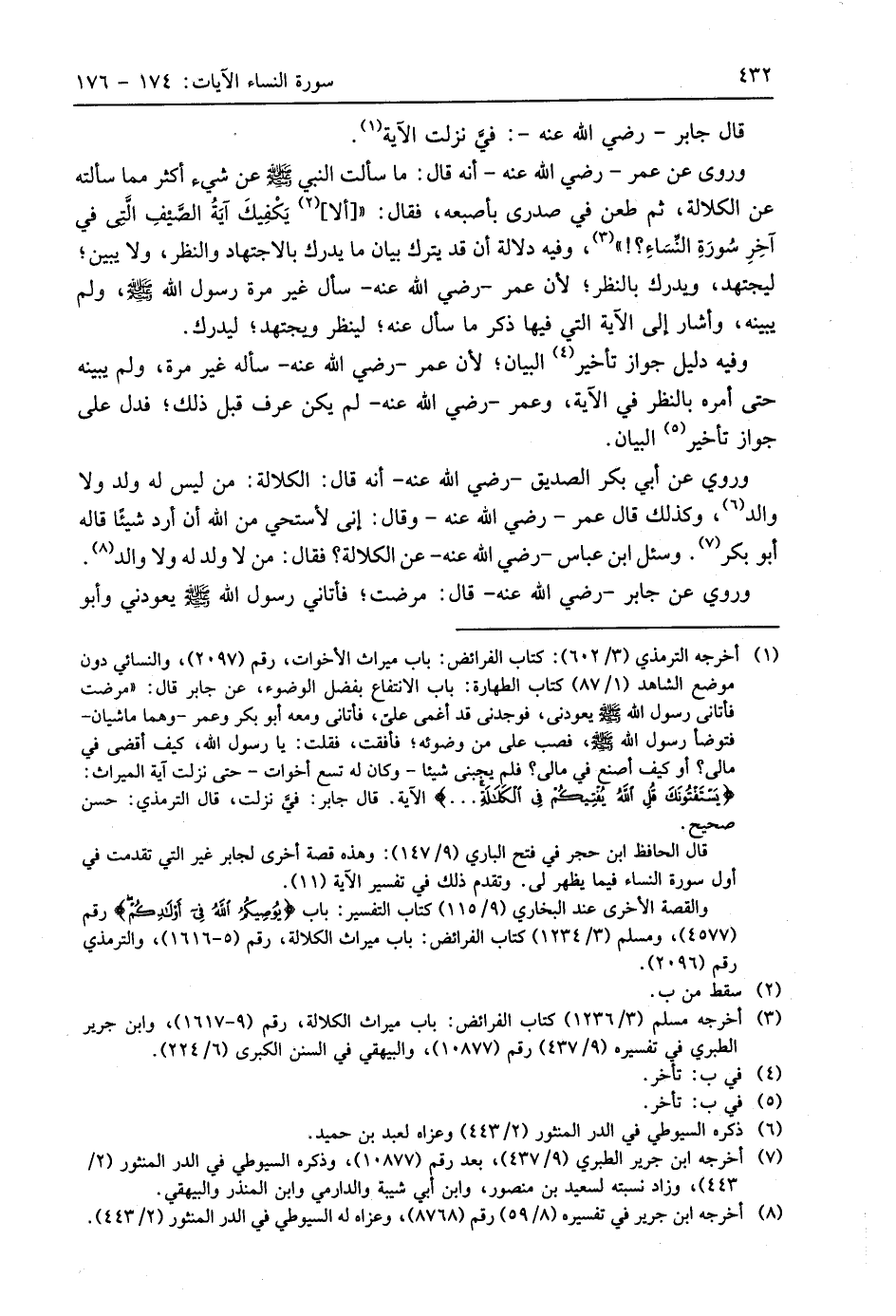 ورُويَ عن عمر - رَضِيَ اللَّهُ عَنْهُ - أنه قال: ما سألت النبي - صَلَّى اللَّهُ عَلَيهِ وَسَلَّمَ - عن شيء أكثر مما سألته عن الكلالة، ثم طعن في صدري بأصبعه، فقال: " ألا يَكْفِيكَ آيَةُ الصَّيفِ التي في آخِرِ سُورَةِ النسَاءِ؟! "، وفيه دلالة أن قد يترك بيان ما يدرك بالاجتهاد والنظر، ولا يبين؛ ليجتهد، ويدرك بالنظر؛ لأن عمر - رَضِيَ اللَّهُ عَنْهُ - سأل غير مرة رسول اللَّه - صَلَّى اللَّهُ عَلَيهِ وَسَلَّمَ -، ولم يبينه، وأشار إلى الآية التي فيها ذكر ما سأل عنه؛ لينظر ويجتهد؛ ليدرك.