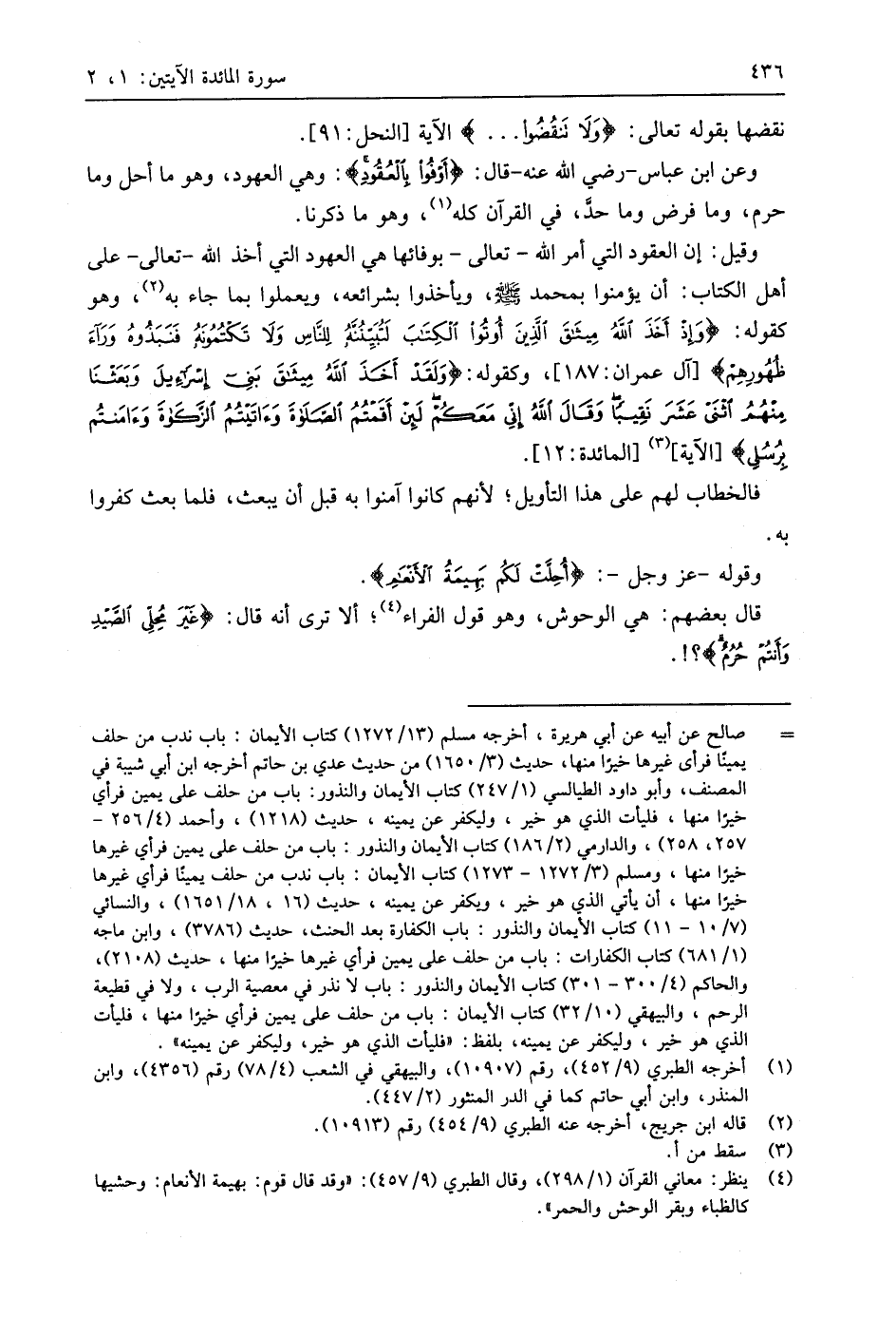 وعن ابن عَبَّاسٍ - رَضِيَ اللَّهُ عَنْهُ - قال: (أَوْفُوا بِالْعُقُودِ): وهي العهود، وهو ما أحل وما حرم، وما فرض وما حد، في القرآن كله، وهو ما ذكرنا.