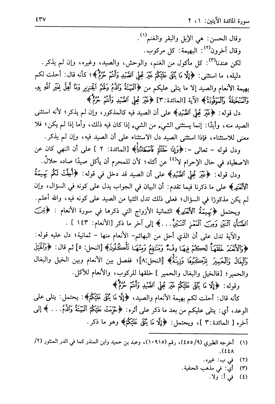 دليله، ما استثنى: (إِلَّا مَا يُتْلَى عَلَيْكُمْ غَيْرَ مُحِلِّي الصَّيْدِ وَأَنْتُمْ حُرُمٌ)؛ كأنه قال: أحلت لكم بهيمة الأنعام والصيد إلا ما يتلى عليكم من (الْمَيْتَةُ وَالدَّمُ وَلَحْمُ الْخِنْزِيرِ وَمَا أُهِلَّ لِغَيْرِ اللَّهِ بِهِ وَالْمُنْخَنِقَةُ وَالْمَوْقُوذَةُ) الآية، (غَيْرَ مُحِلِّي الصَّيْدِ وَأَنْتُمْ حُرُمٌ)