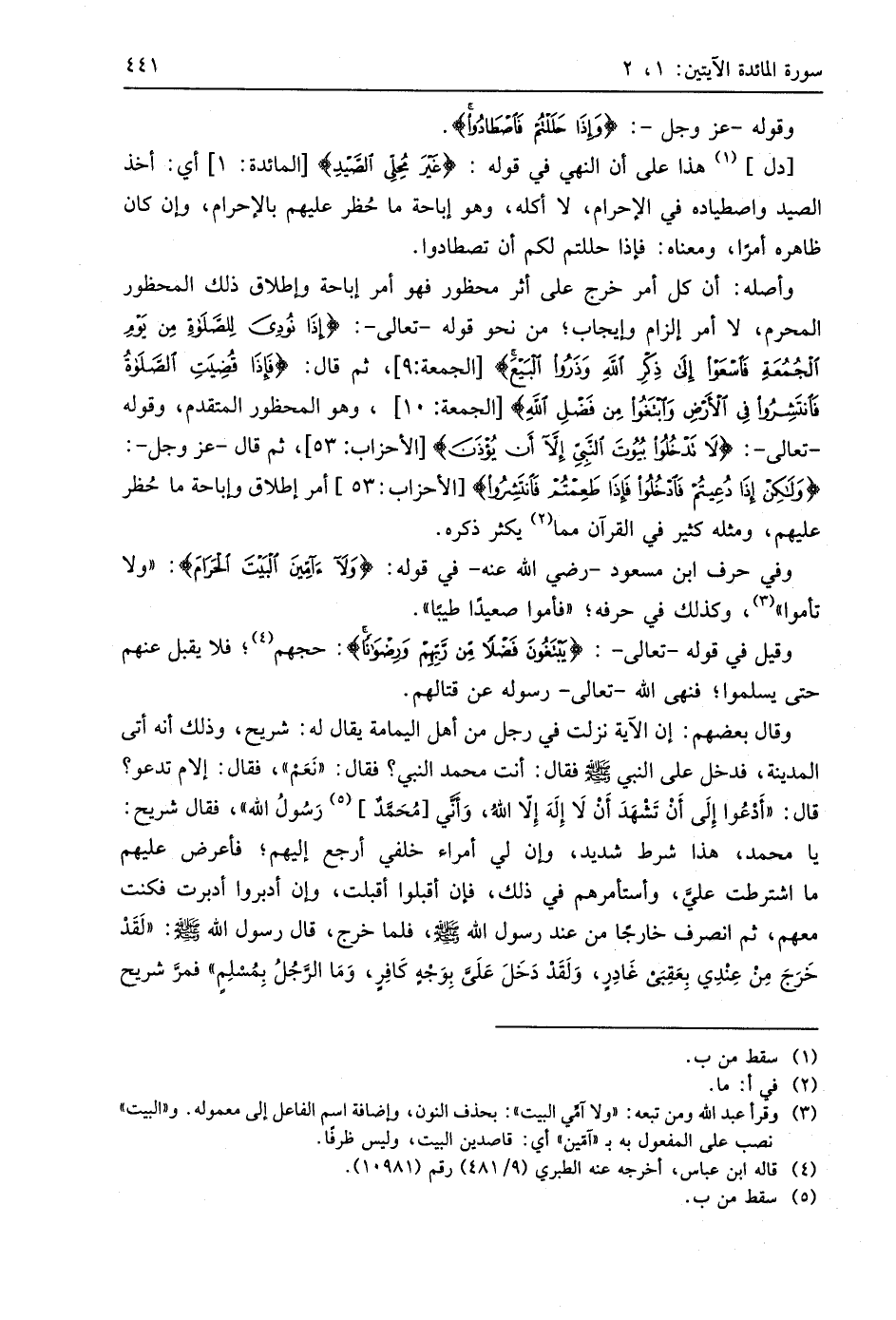 دل هذا على أن النهي في قوله: (غَيْرَ مُحِلِّي الصَّيْدِ) أي: أخذ الصيد واصطياده في الإحرام، لا أكله، وهو إباحة ما حُظر عليهم بالإحرام، وإن كان ظاهره أمرًا، ومعناه: فإذا حللتم لكم أن تصطادوا.