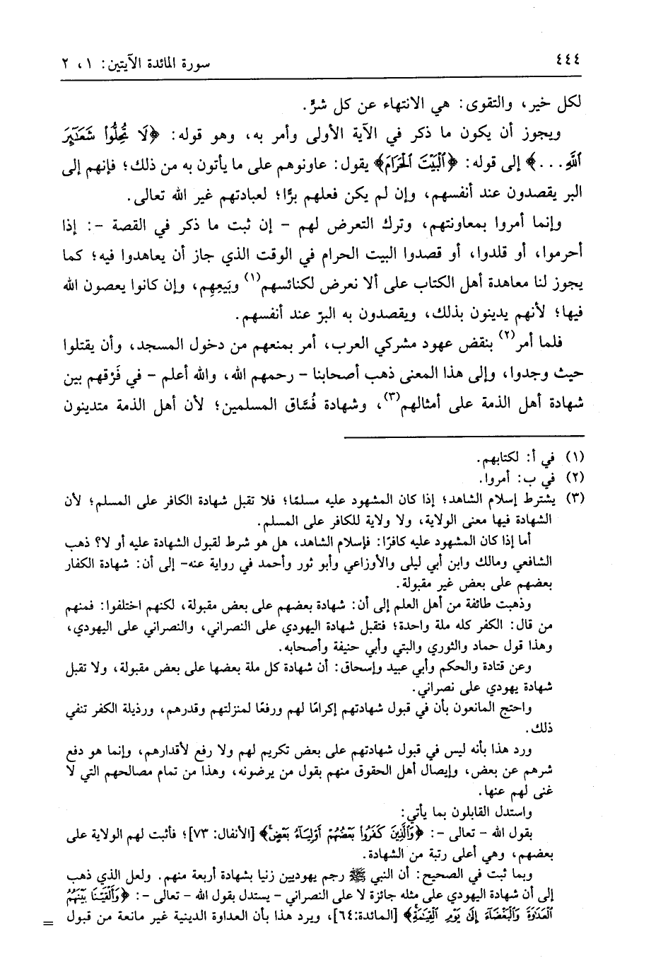 وإنما أمروا بمعاونتهم، وترك التعرض لهم -إن ثبت ما ذكر في القصة-: إذا أحرموا، أو قلدوا، أو قصدوا البيت الحرام في الوقت الذي جاز أن يعاهدوا فيه؛ كما يجوز لنا معاهدة أهل الكتاب على ألا نعرض لكنائسهم وبِيَعِهِم، وإن كانوا يعصون اللَّه فيها؛ لأنهم يدينون بذلك، ويقصدون به البر عند أنفسهم.