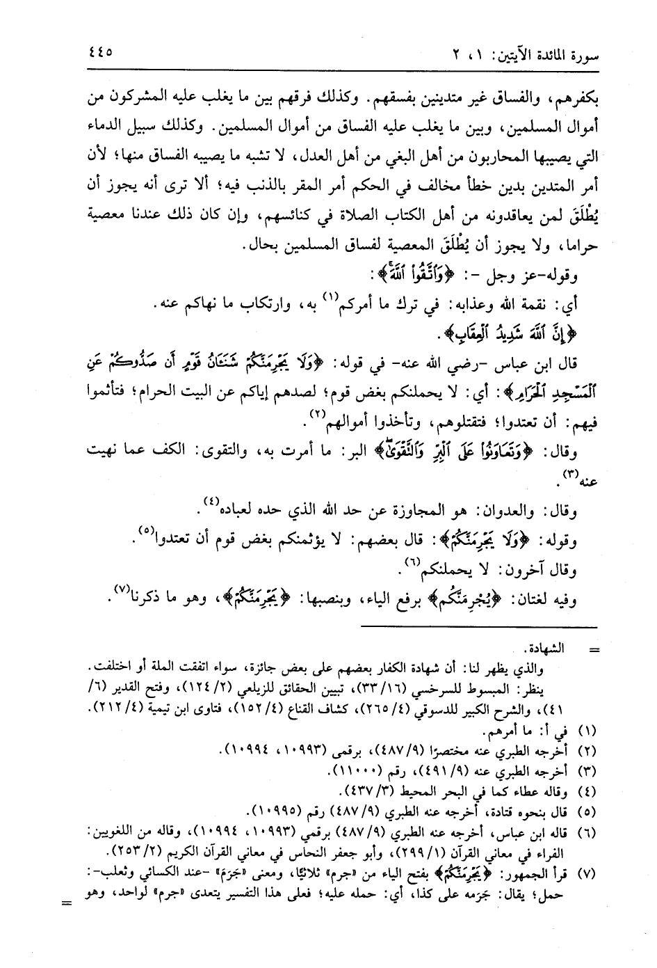 قال ابن عَبَّاسٍ - رضي اللَّه عنه - في قوله: (وَلَا يَجْرِمَنَّكُمْ شَنَئَانُ قَوْمٍ أَنْ صَدُّوكُمْ عَنِ الْمَسْجِدِ الْحَرَامِ): أي: لا يحملنكم بغض قوم؛ لصدهم إياكم عن البيت الحرام؛ فتأثموا فيهم: أن تعتدوا؛ فتقتلوهم، وتأخذوا أموالهم.
