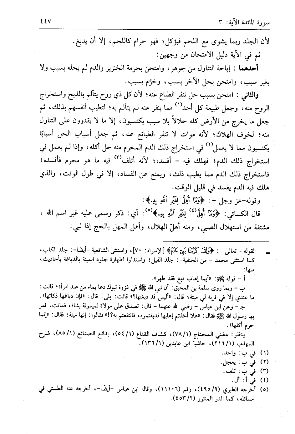 والثاني: امتحن بسبب حل تنفر الطباع عنه؛ لأن كل ذي روح يتألم بالذبح واستخراج الروح منه، وجعل طبيعة كل أحد مما ينفر عنه لم يتألم به؛ لتطيب أنفسهم بذلك، ثم جعل ما يخرج من الأرض كله حلالاً بلا سبب يكتسبون، إلا ما لا يقدرون على التناول منه؛ لخوف الهلاك؛ لأنه موات لا تنفر الطبائع عنه، ثم جعل أسباب الحل أسبابًا يكتسبون مما لا يعمل في استخراج ذلك الدم المحرم منه حل أكله، وإذا لم يعمل في استخراج ذلك الدم؛ فهلك فيه - أفسده؛ لأنه أتلف فيه ما هو محرم فأفسده؛ فاستخراج ذلك الدم مما يطيب ذلك، ويمنع عن الفساد، إلا في طول الوقت، والذي هلك فيه الدم يفسد في قليل الوقت.