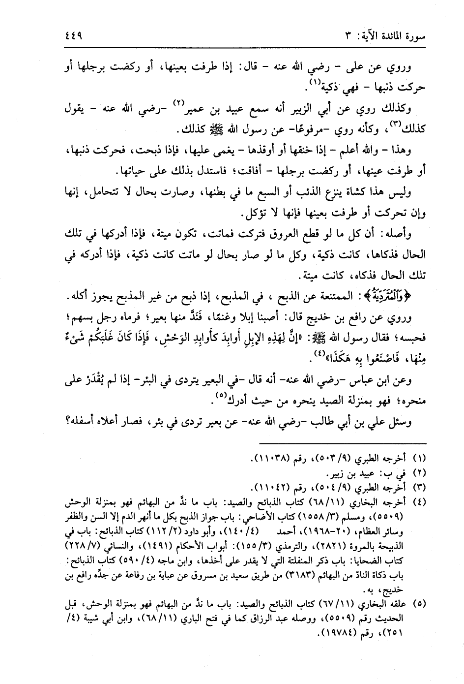وعن ابن عَبَّاسٍ - رَضِيَ اللَّهُ عَنْهُ - أنه قال - في البعير يتردى في البئر - إذا لم يُقْدَرْ على منحره؛ فهو بمنزلة الصيد ينحره من حيث أدرك.