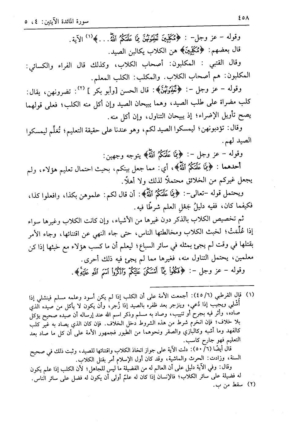 وقوله - عَزَّ وَجَلَّ -: (مُكَلِّبِينَ تُعَلِّمُونَهُنَّ مِمَّا عَلَّمَكُمُ اللَّهُ. . .) الآية.
