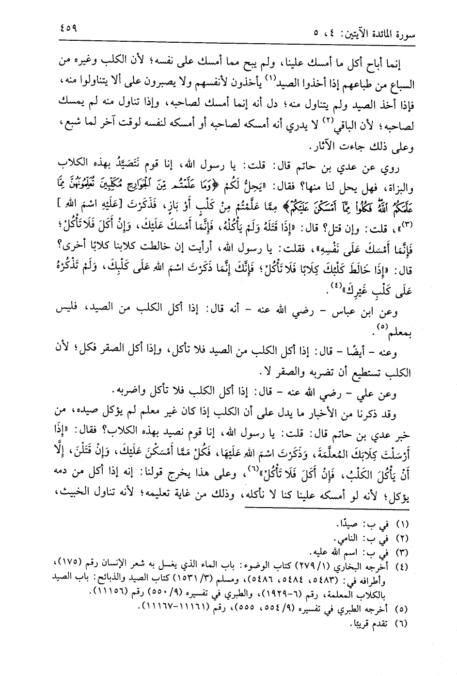 روي عن عدي بن حاتم قال: قلت: يا رسول اللَّه، إنا قوم نَتَصَيدُ بهذه الكلاب والبزاة، فهل يحل لنا منها؛ فقال: " يَحِلُّ لَكُم (وَمَا عَلَّمْتُمْ مِنَ الْجَوَارِحِ مُكَلِّبِينَ تُعَلِّمُونَهُنَّ مِمَّا عَلَّمَكُمُ اللَّهُ فَكُلُوا مِمَّا أَمْسَكْنَ عَلَيْكُمْ) مِما عَلَّمْتُمْ مِنْ كَلْب أَوْ بَازٍ، فَذَكَرتَ عَلَيهِ اسْمَ اللَّهَ " قلت: وإن قتل؟ قال: " إِذَا قَتَلَهُ وَلَمْ يَأْكُلْهُ، فَإِنَّمَا أَمْسَكَ عَلَيكَ، وَإِنْ أَكَلَ فَلَا تَأْكُلْ؛ فَإِنَّمَا أَمْسَكَ عَلَى نَفْسِهِ "، فقلت: يا رسول اللَّه، أرأيت إن خالطت كلابنا كلابًا أخرى؟ قال: " إِذَا خَالَطَ كَلْبُكَ كِلَابًا فَلَا تَأْكُلْ؛ فَإِنَّكَ إِنَّمَا ذَكَرتَ اسْمَ اللَّهَ عَلَى كَلْبِكَ، وَلَم تَذْكُرهُ عَلَى كَلْبِ غَيرِكَ ".