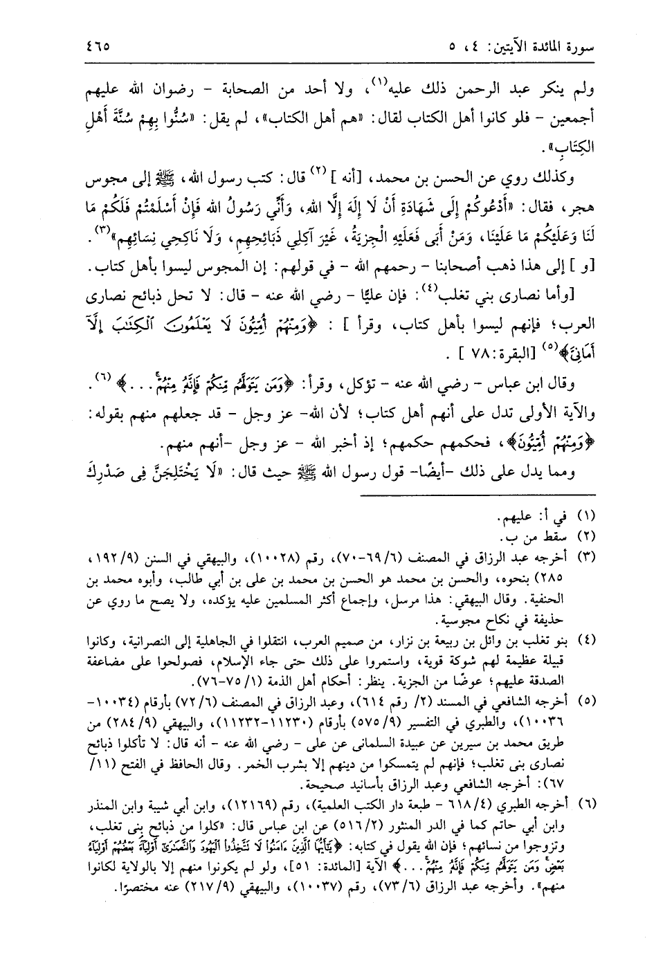 ولم ينكر عبد الرحمن ذلك عليه، ولا أحد من الصحابة - رضوان اللَّه عليهم أجمعين - فلو كانوا أهل الكتاب لقال: " هم أهل الكتاب "، لم يقل: " سُنُّوا بِهِم سُنَّةَ أَهْلِ الكِتَابِ ".