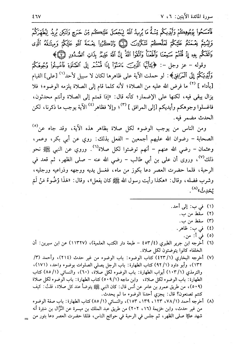 وقوله - عَزَّ وَجَلَّ -: (يَا أَيُّهَا الَّذِينَ آمَنُوا إِذَا قُمْتُمْ إِلَى الصَّلَاةِ فَاغْسِلُوا وُجُوهَكُمْ وَأَيْدِيَكُمْ إِلَى الْمَرَافِقِ): لو حملت الآية على ظاهرها لكان لا سبيل لأحد على القيام بأداء ما فرض اللَّه عليه من الصلاة؛ لأنه كلما قام إلى الصلاة يلزمه الوضوء؛ فلا يزال يبقى فيه، لكنها على الإضمار؛ كأنه قال: " إذا قمتم إلى الصلاة وأنتم محدثون، فاغسلوا وجوهكم وأيديكم إلى المرافق؛ وإلا فظاهر الآية يوجب ما ذكرنا، لكن الحدث مضمر فيه.