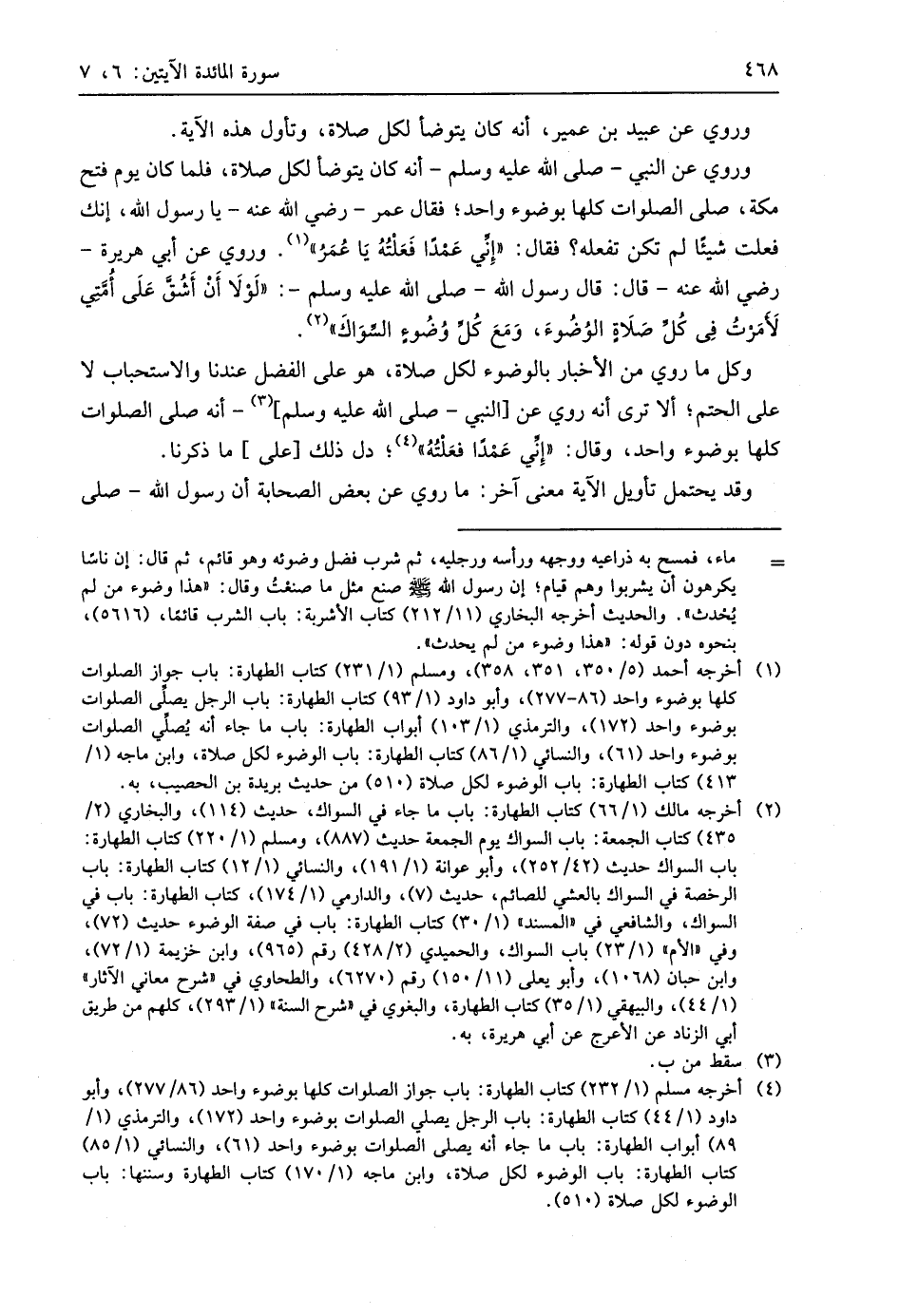 وروي عن النبي - صَلَّى اللَّهُ عَلَيهِ وَسَلَّمَ - أنه كان يتوضأ لكل صلاة، فلما كان يوم فتح مكة، صلى الصلوات كلها بوضوء واحد؛ فقال عمر - رَضِيَ اللَّهُ عَنْهُ - يا رسول اللَّه، إنك فعلت شيئا لم تكن تفعله؟ فقال: " إِني عَمدًا فَعَلْتُهُ يَا عُمَرُ ". وروي عن أبي هريرة - رَضِيَ اللَّهُ عَنْهُ - قال: قال رسول اللَّه - صَلَّى اللَّهُ عَلَيهِ وَسَلَّمَ -: " لَوْلَا أَنْ أَشُق عَلَى أمَّتي لَأَمَرتُ فِي كُل صَلَاة الوُضُوءَ، وَمَعَ كُلً وُضُوء السوَاكَ ".