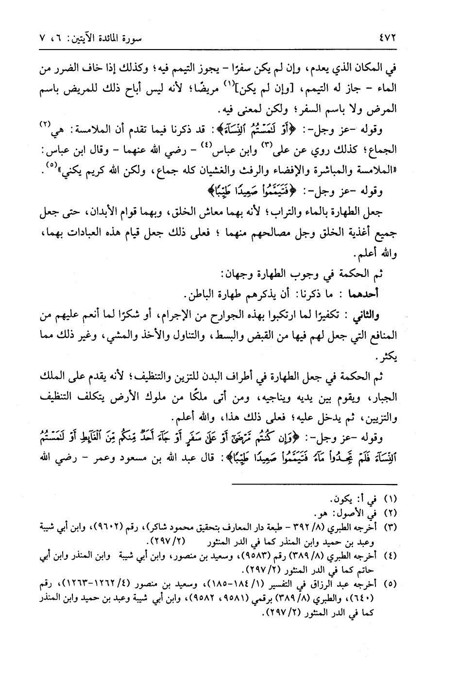 وقوله - عَزَّ وَجَلَّ -: (وَإِنْ كُنْتُمْ مَرْضَى أَوْ عَلَى سَفَرٍ أَوْ جَاءَ أَحَدٌ مِنْكُمْ مِنَ الْغَائِطِ أَوْ لَامَسْتُمُ النِّسَاءَ فَلَمْ تَجِدُوا مَاءً فَتَيَمَّمُوا صَعِيدًا طَيِّبًا): قال عبد اللَّه بن مسعود وعمر - رضي اللَّه عنهما -