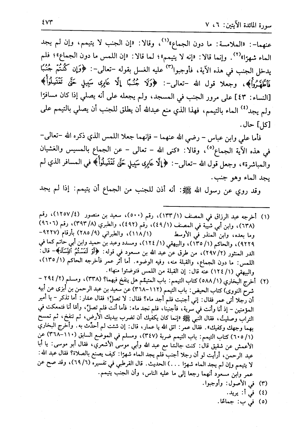 فأما علي وابن عَبَّاسٍ - رضي اللَّه عنهما - فإنهما جعلا اللمس الذي ذكره اللَّه - تعالى - في هذه الآية الجماع، وقالا: " كنى اللَّه - تعالى - عن الجماع بالمسيس والغشيان والمباشرة، وجعل قول اللَّه - تعالى -: (إِلَّا عَابِرِي سَبِيلٍ حَتَّى تَغْتَسِلُوا) في المسافر الذي لم يجد الماء وهو جنب.