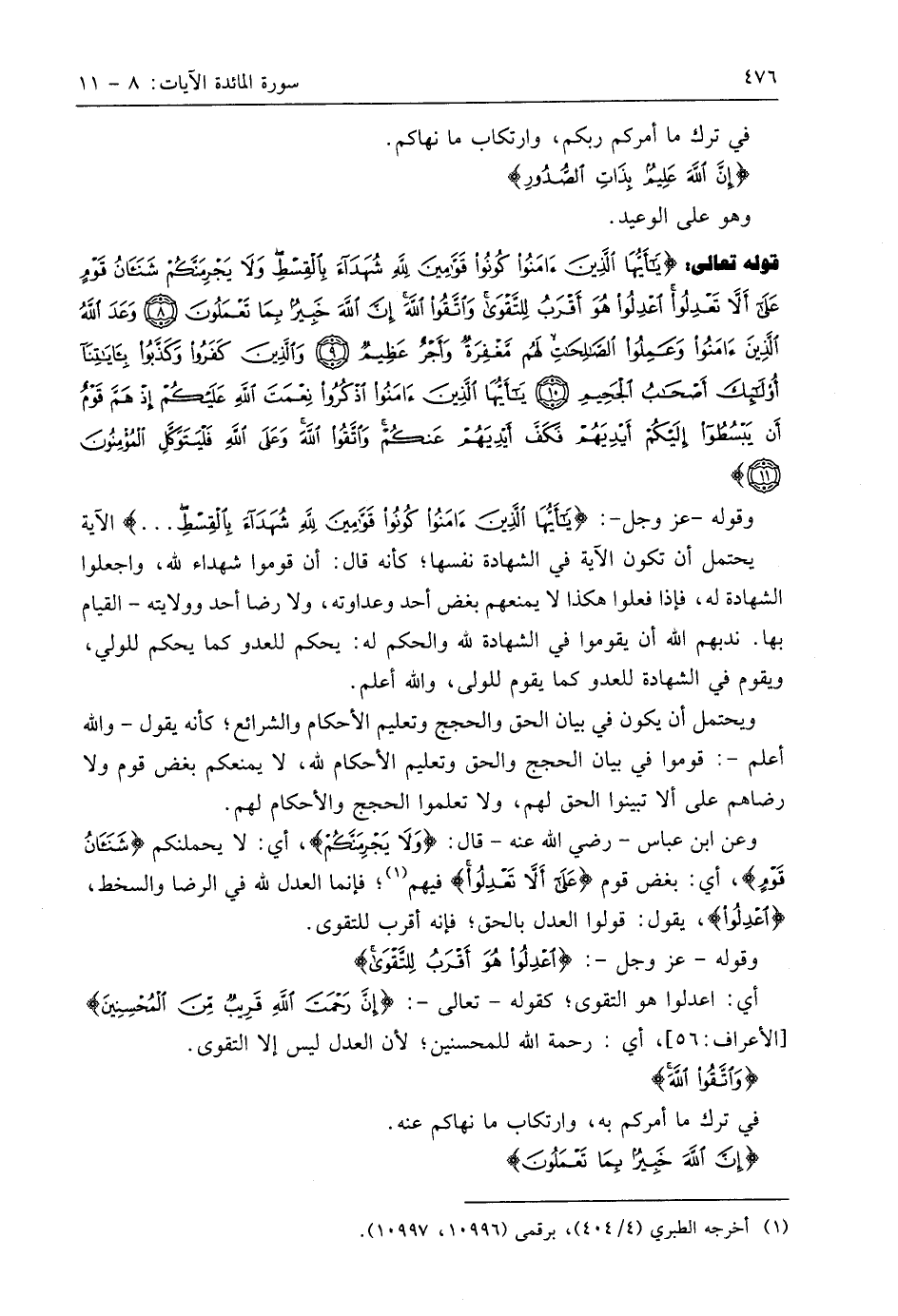 قوله تعالى: (يَا أَيُّهَا الَّذِينَ آمَنُوا كُونُوا قَوَّامِينَ لِلَّهِ شُهَدَاءَ بِالْقِسْطِ وَلَا يَجْرِمَنَّكُمْ شَنَئَانُ قَوْمٍ عَلَى أَلَّا تَعْدِلُوا اعْدِلُوا هُوَ أَقْرَبُ لِلتَّقْوَى وَاتَّقُوا اللَّهَ إِنَّ اللَّهَ خَبِيرٌ بِمَا تَعْمَلُونَ (8) وَعَدَ اللَّهُ الَّذِينَ آمَنُوا وَعَمِلُوا الصَّالِحَاتِ لَهُمْ مَغْفِرَةٌ وَأَجْرٌ عَظِيمٌ (9) وَالَّذِينَ كَفَرُوا وَكَذَّبُوا بِآيَاتِنَا أُولَئِكَ أَصْحَابُ الْجَحِيمِ (10) يَا أَيُّهَا الَّذِينَ آمَنُوا اذْكُرُوا نِعْمَتَ اللَّهِ عَلَيْكُمْ إِذْ هَمَّ قَوْمٌ أَنْ يَبْسُطُوا إِلَيْكُمْ أَيْدِيَهُمْ فَكَفَّ أَيْدِيَهُمْ عَنْكُمْ وَاتَّقُوا اللَّهَ وَعَلَى اللَّهِ فَلْيَتَوَكَّلِ الْمُؤْمِنُونَ (11)