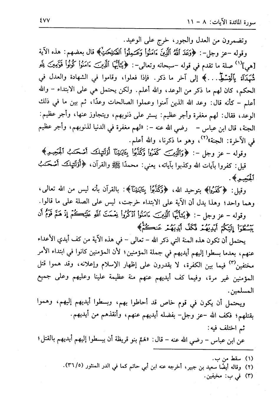 وقوله - عَزَّ وَجَلَّ -: (وَعَدَ اللَّهُ الَّذِينَ آمَنُوا وَعَمِلُوا الصَّالِحَاتِ ... (9) قَالَ بَعْضُهُمْ: هذه الآية هي صلة ما تقدم في قوله - سبحانه وتعالى -: (يَا أَيُّهَا الَّذِينَ آمَنُوا كُونُوا قَوَّامِينَ لِلَّهِ شُهَدَاءَ بِالْقِسْطِ. . .) إلى آخر ما ذكر. فإذا فعلوا، وقاموا في الشهادة والعدل في الحكم، كان لهم ما ذكر من الوعد، واللَّه أعلم. ولكن يحتمل هي على الابتداء - والله أعلم - كأنه قال: وعد اللَّه الذين آمنوا وعملوا الصالحات وعدًا، ثم بين ما في ذلك الوعد، فقال: لهم مغفرة وأجر عظيم: يستر على ذنوبهم، ويتجاوز عنها، وأجر عظيم: الجنة، قال ابن عَبَّاسٍ - رَضِيَ اللَّهُ عَنْهُ -: " لهم مغفرة في الدنيا لذنوبهم، وأجر عظيم في الآخرة: الجنة "، وهو ما ذكرنا، واللَّه أعلم.
