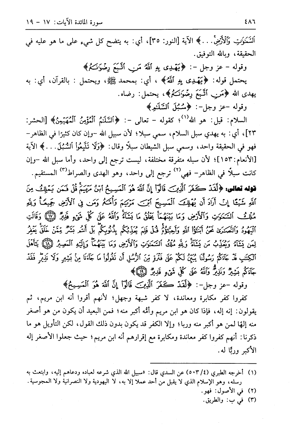 قوله تعالى (لَقَدْ كَفَرَ الَّذِينَ قَالُوا إِنَّ اللَّهَ هُوَ الْمَسِيحُ ابْنُ مَرْيَمَ قُلْ فَمَنْ يَمْلِكُ مِنَ اللَّهِ شَيْئًا إِنْ أَرَادَ أَنْ يُهْلِكَ الْمَسِيحَ ابْنَ مَرْيَمَ وَأُمَّهُ وَمَنْ فِي الْأَرْضِ جَمِيعًا وَلِلَّهِ مُلْكُ السَّمَاوَاتِ وَالْأَرْضِ وَمَا بَيْنَهُمَا يَخْلُقُ مَا يَشَاءُ وَاللَّهُ عَلَى كُلِّ شَيْءٍ قَدِيرٌ (17) وَقَالَتِ الْيَهُودُ وَالنَّصَارَى نَحْنُ أَبْنَاءُ اللَّهِ وَأَحِبَّاؤُهُ قُلْ فَلِمَ يُعَذِّبُكُمْ بِذُنُوبِكُمْ بَلْ أَنْتُمْ بَشَرٌ مِمَّنْ خَلَقَ يَغْفِرُ لِمَنْ يَشَاءُ وَيُعَذِّبُ مَنْ يَشَاءُ وَلِلَّهِ مُلْكُ السَّمَاوَاتِ وَالْأَرْضِ وَمَا بَيْنَهُمَا وَإِلَيْهِ الْمَصِيرُ (18) يَا أَهْلَ الْكِتَابِ قَدْ جَاءَكُمْ رَسُولُنَا يُبَيِّنُ لَكُمْ عَلَى فَتْرَةٍ مِنَ الرُّسُلِ أَنْ تَقُولُوا مَا جَاءَنَا مِنْ بَشِيرٍ وَلَا نَذِيرٍ فَقَدْ جَاءَكُمْ بَشِيرٌ وَنَذِيرٌ وَاللَّهُ عَلَى كُلِّ شَيْءٍ قَدِيرٌ (19)