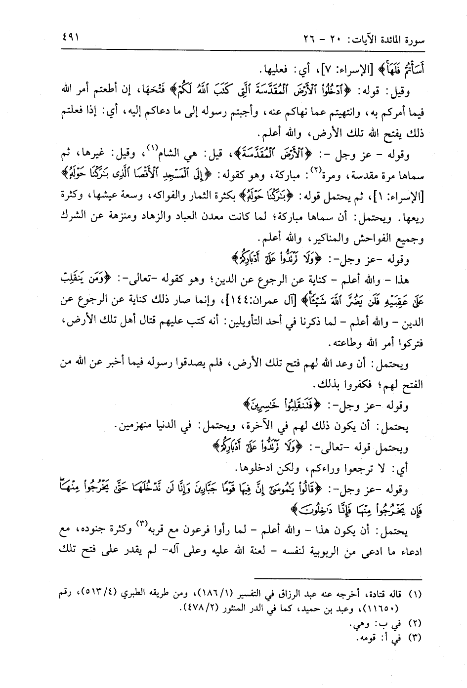وقوله - عَزَّ وَجَلَّ -: (الْأَرْضَ الْمُقَدَّسَةَ)، قيل: هي الشام، وقيل: غيرها، ثم سماها مرة مقدسة، ومرة: مباركة، وهو كقوله: (إِلَى الْمَسْجِدِ الْأَقْصَا الَّذِي بَارَكْنَا حَوْلَهُ)، ثم يحتمل قوله: (بَارَكْنَا حَوْلَهُ) بكثرة الثمار والفواكه، وسعة عيشها، وكثرة ريعها. ويحتمل: أن سماها مباركة؛ لما كانت معدن العباد والزهاد ومنزهة عن الشرك وجميع الفواحش والمناكير، واللَّه أعلم.